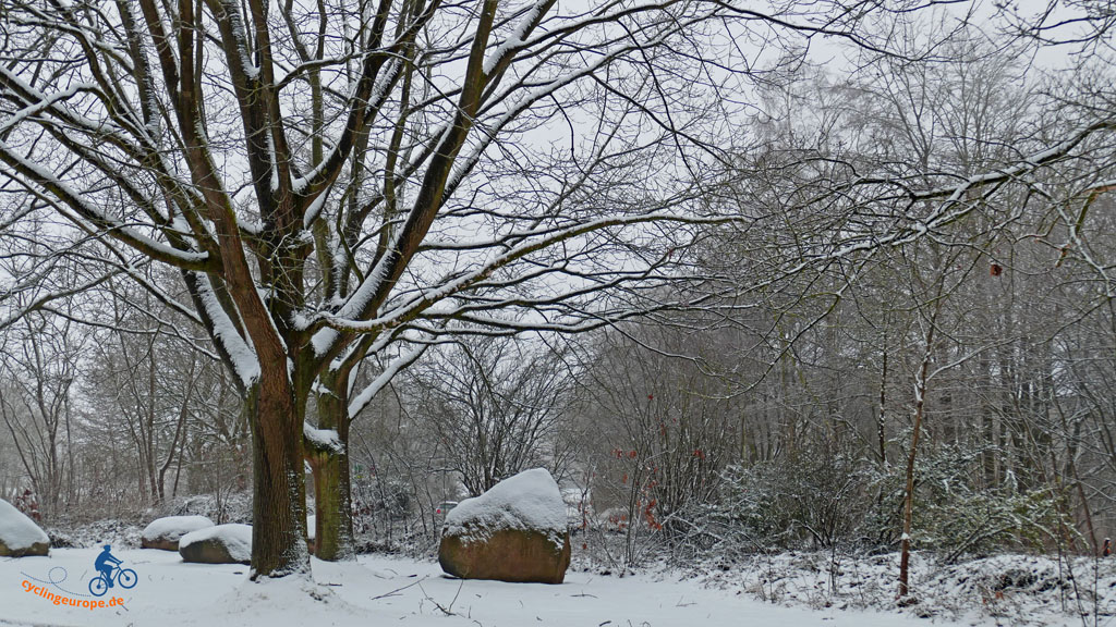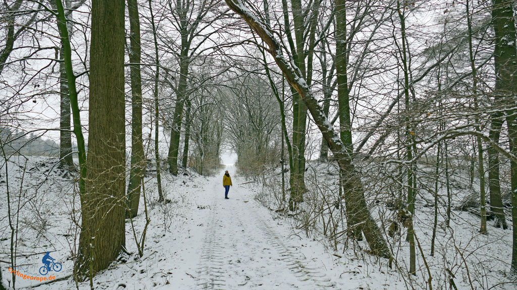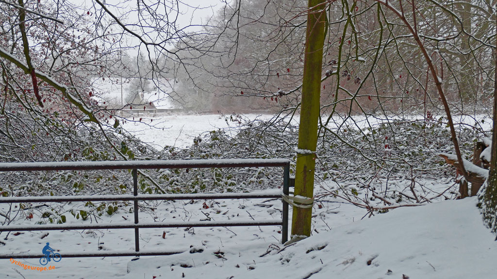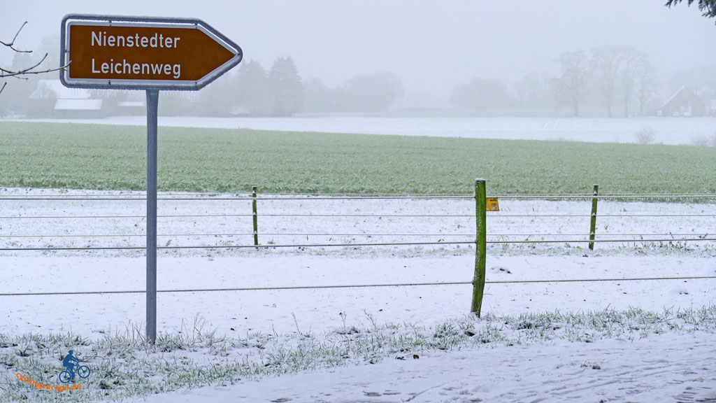 Wir dürfen also ein Stückchen durch Frankreich laufen, so kommt es einem fast vor. Am Ende der Straße beginnt ein Privatgrundstück, durch das einmal der Weg nach Clues und über die Brücke nach Nienstedt führte. Für uns heißt es jedoch: Rechts ab, marsch, marsch. Wir befinden uns nun tatsächlich auf dem historischen Leichenweg, Er windet sich bergauf an Äckwern entlang durch die Landschaft. Nach ein paar hundert Metern, dort wo der Weg wieder bergab führt, wartet eine Bank auf müde Wanderer. Bei der winterlichen Witterung für uns keine Verlockung. Wir haben einen anderen Rastplatz im Auge.