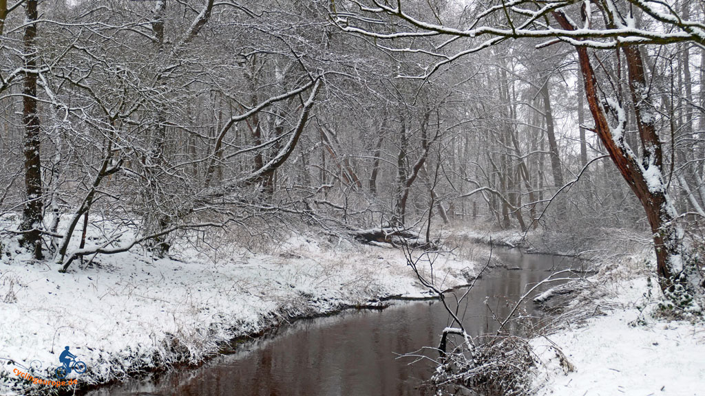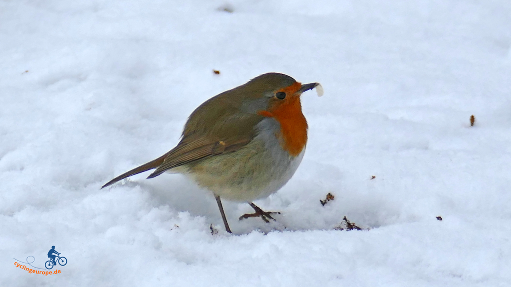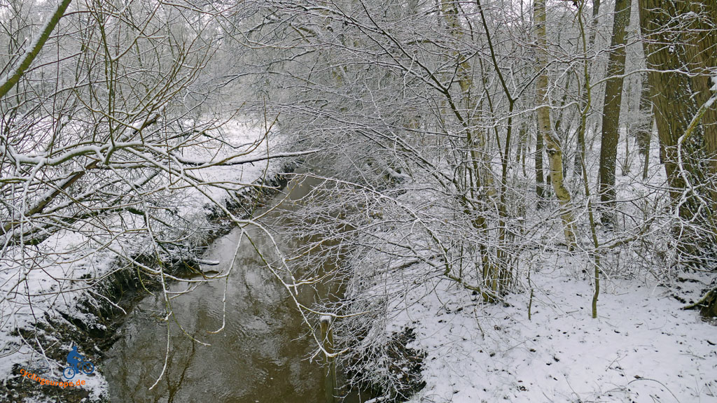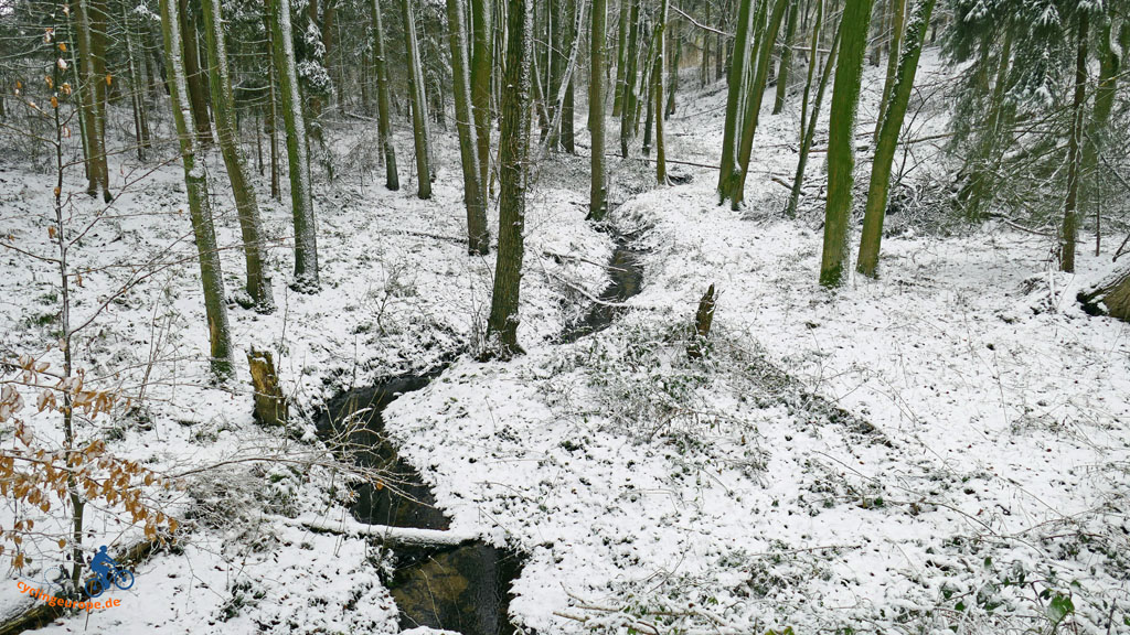 Hinter Ramminghausen müssen wir noch einmal auf die Höhe, bevor es in das Tal der Twillbeeke hinab geht. Der Bach schlängelt sich malerisch durch sein kleines Tal. Immer wieder begegnet uns hier ein Rotkehlchen. Gar nicht scheu sucht es mal ein Würmchen, mal ein Insekt zwischen den Blättern an schneefreien Stellen.