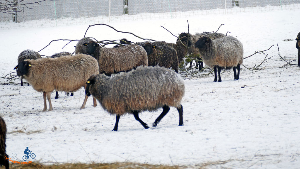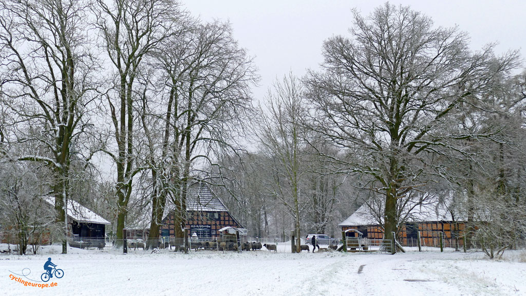 Danach setzen wir unseren Weg in Richtung Steimke fort. Aber wir wollen nicht durch den Ort, sondern queren hier noch einmal die Hache. Denn auf der anderen Seite lockt ein schöner Feldweg, der parallel zur Hache auf Syke zu läuft. Unterwegs begrüßen uns die Rinder, die hier den ganzen Winter im Freien verbringen und sich ein entsprechend wolliges Winterfell zugelegt haben.