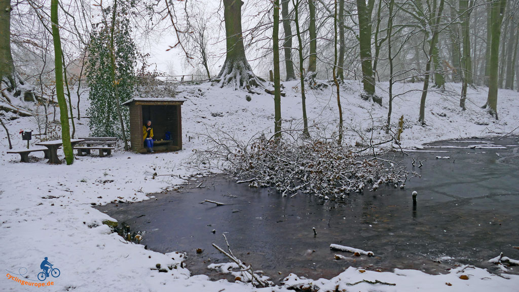 Wir verlassen hier die Straße und folgen einem Weg bergab. Rechts hat sich ein tiefer Taleinschnitt aufgetan, der wohl im Zuge der Eiszeit als Schmelzwasserrinne entstanden ist. Im Tal sprudelt heute eine Quelle, die talabwärts mehrere Fischteiche mit Wasser versorgt und hier einen kleinen Stauteich bildet. Am Ende steht rechts unser Zwischenziel, eine winzige Wanderhütte mit Platz für zwei. Sie bietet uns jetzt in der kalten Winterzeit einen trockenen, windgeschützten Sitzplatz für eine kleine Rast. Schließlich wartet im Rucksack heißer Tee und Stollen, die nun endlich verzehrt werden wollen. Über einen Damm, der den Stauteich abschließt, gelangen wir trockenen Fußes dorthin zu der Hütte und lassen es uns gutgehen.