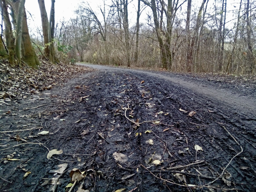 Die neuen Abschnitte sollen wassergebundene Decken erhalten. Damit werden weitere Holperstrecken geschaffen, mit denen man auf Dauer keinen Freizeitradler zum Umsteigen auf das Fahrrad für die alltäglichen Wege - zur Arbeit, zum Einkaufen - gewinnen wird. Was aus wassergebundenen Decken wird, ließ sich im Winterhalbjahr sehr deutlich im Hasepark studieren. Inzwischen ist der Weg soweit abgetrocknet und durch die Radfahrer glatt gefahren, dass sich das Problem wahrscheinlich erst wieder ab Herbst 2016 stellt. Wie es dann wieder aussehen wird, siehe Titelbild zu diesem Beitrag. Dieses ewige Sparen an der Qualität von Radwegen kann man sich weder für die Gemeinde Bissendorf noch für die Stadt Osnabrück erklären.
