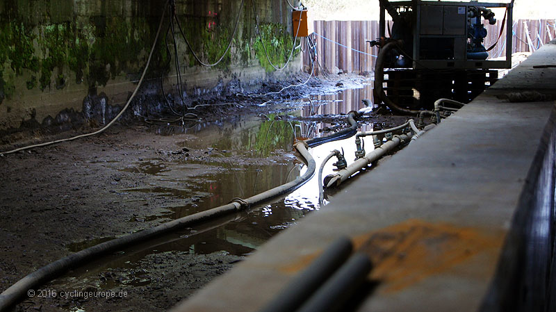 Die Trogstrecke unter Bahn hindurch ist im Bau. Damit wird der Weg frei für weitere flussnahe Abschnitte Richtung Bifurkation. Hier sieht man ja bekanntlich bisher auf weiten Strecken nichts von der Hase. Im Januar hieß es im Interview des ADFC mit Stadtbaurat Otte: "Wesentlicher Bestandteil (...) ist die Unterquerung der Bahnstrecke. Dafür wird eine sogenannte Troglösung im Zeitraum April - Dezember 2015 gebaut. Im Anschluss werden die Wege radfahrtauglich hergerichtet." Der Fertigstellungs-Termin ist geplatzt. Aktuell (2016-02-26) sind noch nicht einmal die Betonierungsarbeiten abgeschlossen. Der Trog befindet sich in weiten Teilen also noch im Rohbau. Immerhin wird schon an den Zuwegungen gearbeitet. Es dürfte aber Sommer werden, bis alle Arbeiten abgeschlossen sind.