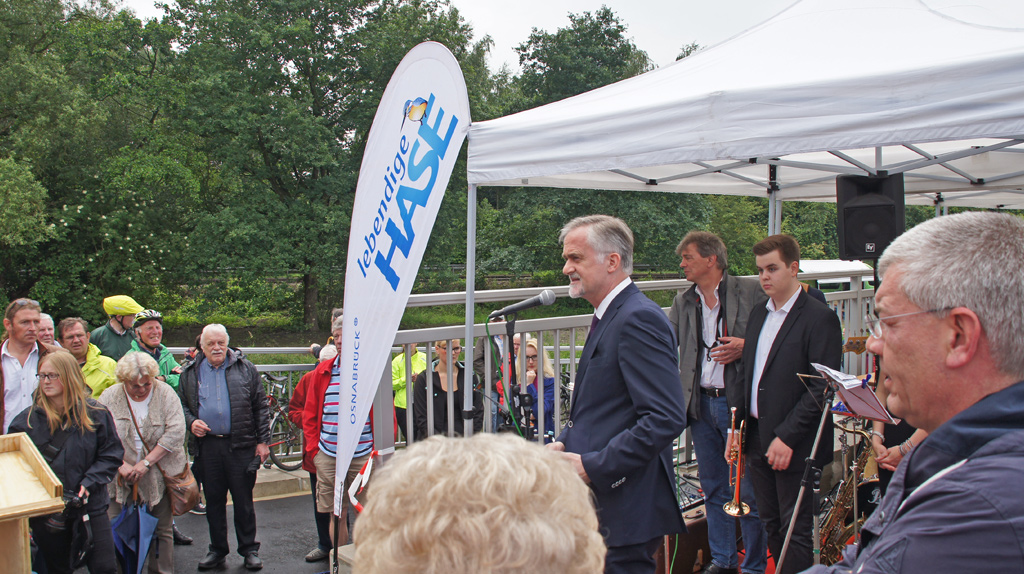 Am Samstag, den 18. Juni 2016 wird mit einem Fest am „Hasestrand“ der neue Abschnitt des Haseuferwegs im Osnabrücker Osten freigegeben. Der neue Flusswegabschnitt schließt die die wichtigste Lücke des Haseuferweges im Ostteil der Stadt. OB Wolfgang Griesert gibt das 2500 Meter lange Wegstück zwischen der Schellenbergbrücke und dem Heideweg pünktlich um 14 Uhr frei. Bei dem Fest, das von Von 12 bis 16 Uhr geht, wird über das Ausbau-Vorhaben informiert und es gibt ein Rahmenprogramm mit vielen Aktivitäten. U.a. gibt es bei ausreichendem Wasserstand Kanufahren auf der Hase, daneben können sich die Besucher auf die Suche nach am Fluss versteckten Geocaches begeben oder die Hase und ihre Bewohner im rollenden Umweltlabor „Grashüpfer“ erforschen. Die Jazz-Combo der Gesamtschule Schinkel sorgt für Musik, daneben informieren Natur-/Umwelt-/Haseschützer über ihre Arbeit.