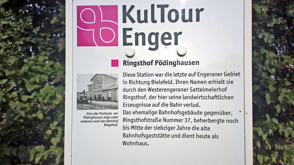 Enger verlassen wir auf dem als Radweg angelegten Bruchweg, treffen auf die Trasse und wenden uns ihr folgend südwärts bis zur Wertherstra0e. Ab dort im Zickzack der Ausschilderung nach Jöllenbeck folgen, bis man Am Bahnbogen wieder auf die Trasse einschwenkt. Nach kurzer Fahrt geht es links über Am Sportplatz zur Jöllenbecker Straße. Hier rechts bis zur Ringsthofstraße. Sie bringt uns auf den schönsten Abschnitt der Trasse, beginnend am ehemaligen Bahnhof Pödinghausen, führt von dort ansteigend in schönen Bögen hinauf nach Jöllenbeck. Man riecht förmlich noch den Dampf und hört das Tuten der Lok, wenn man unter der 1925 erbauten Brücke Am Sonnenbrink hindurch führt.