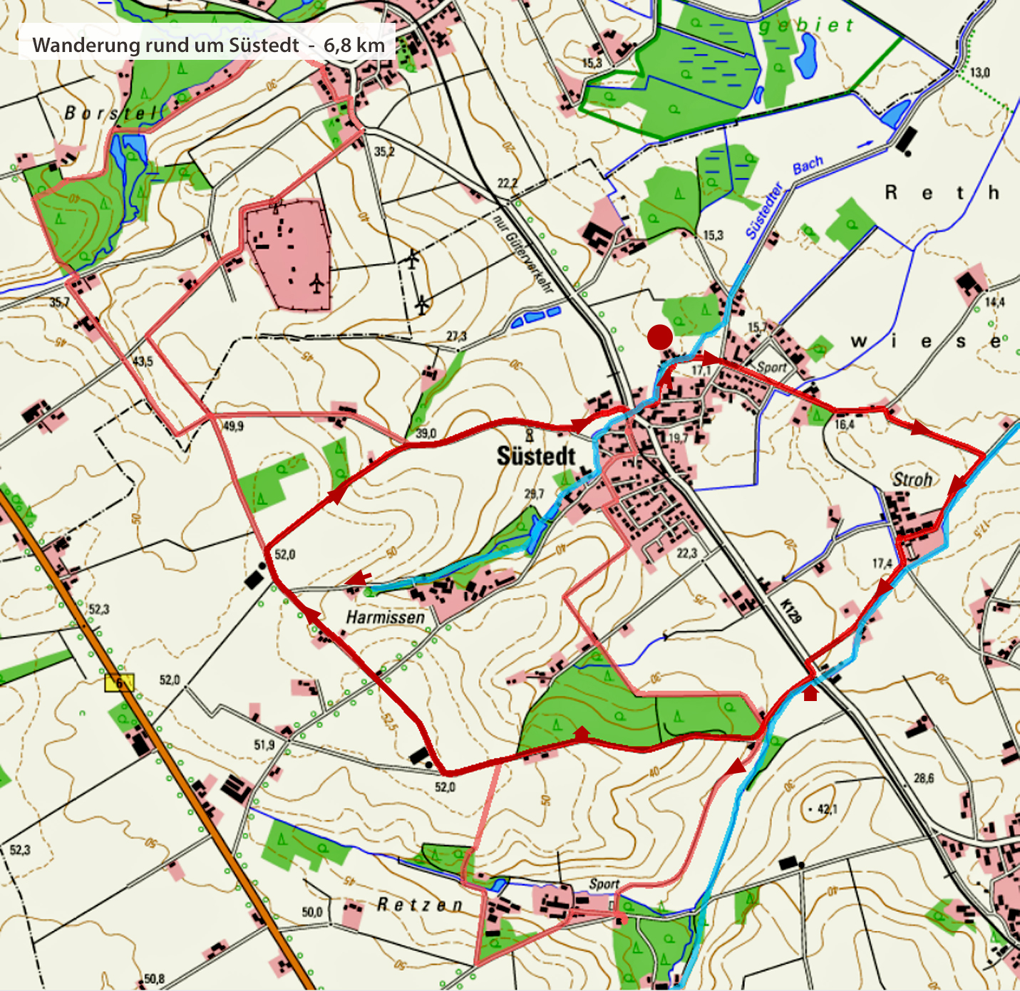 Eine kurze, informative Wanderung für sonnige Tage zu jeder Jahreszeit. Abwechslung bieten das Auf und Ab, die eine oder andere Sehenswürdigkeit sowie die schönen Ausblicke von den Geesthöhen. Süstedt ist per Auto oder Bus erreichbar, der hier die Bahn abgelöst hat und regelmäßig zwischen Syke und Eystrup hin und her pendelt - Fahrplan siehe rechte Spalte unter VBN
