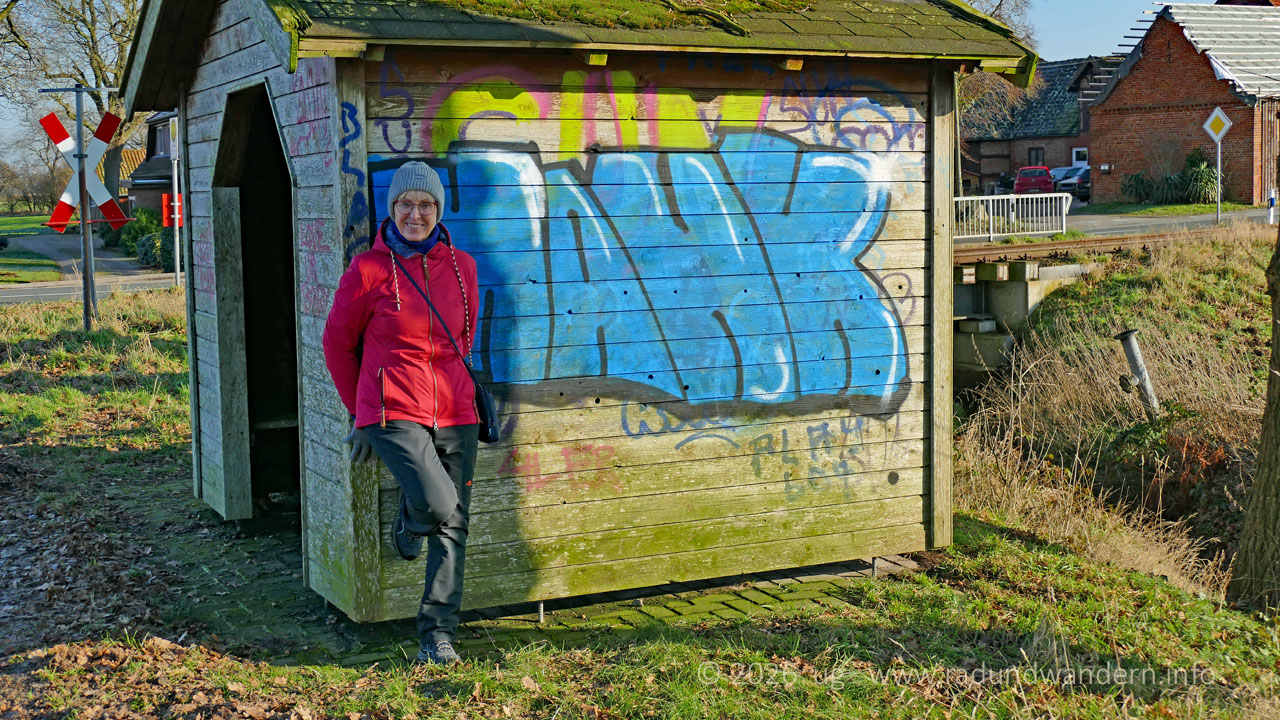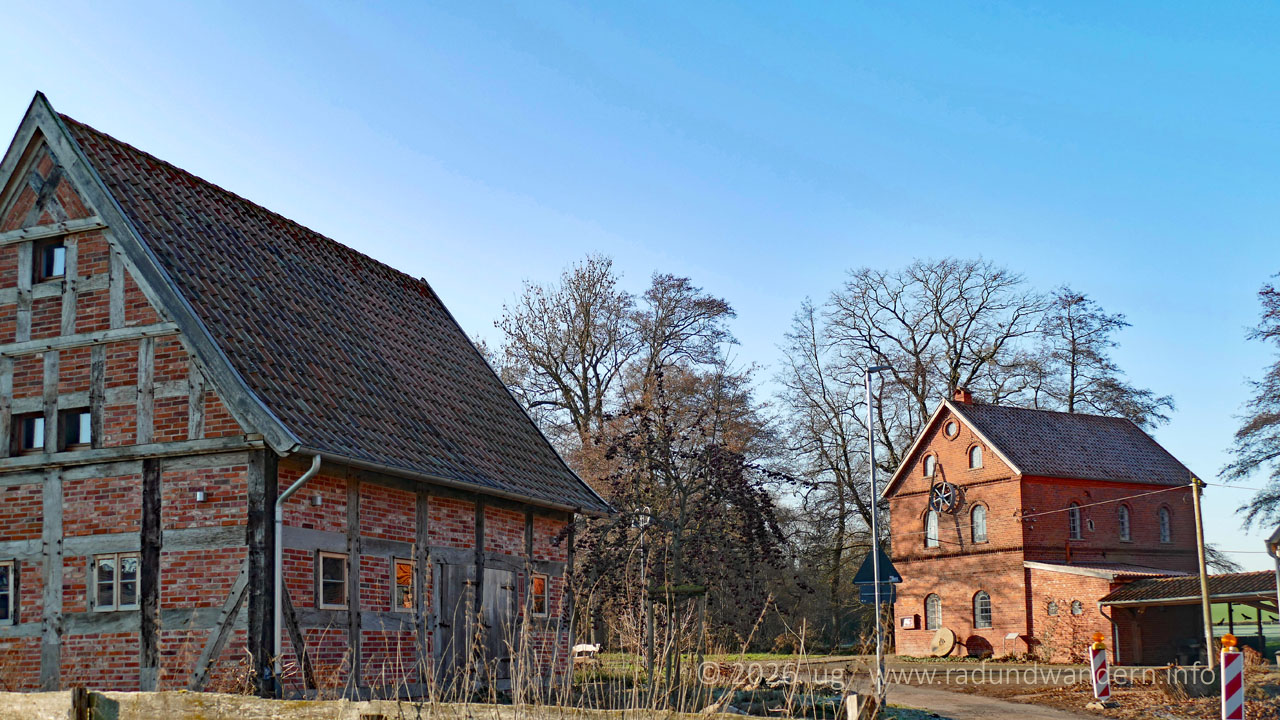 Unten im Ort angekommen queren wir die Bahnstrecke, die von Syke über Hoya nach Eystrup führt, und die nur noch gelegentlich befahren wird. Ursprünglich lag hier der Bahnhof. Die heutige Haltestelle befindet sich jetzt am anderen Ende des Ortes zusammen mit der Bushaltestelle. Wer mag, kann noch ein Schlenker nach rechts machen, wieder über die Bahn hinweg, in die Schmiedestraße. Hier können wir noch einen Blick auf die ehemalige Schmiede werfen, bevor es zurück zur Nolteschen Mühle oder zur Bushaltestelle geht.