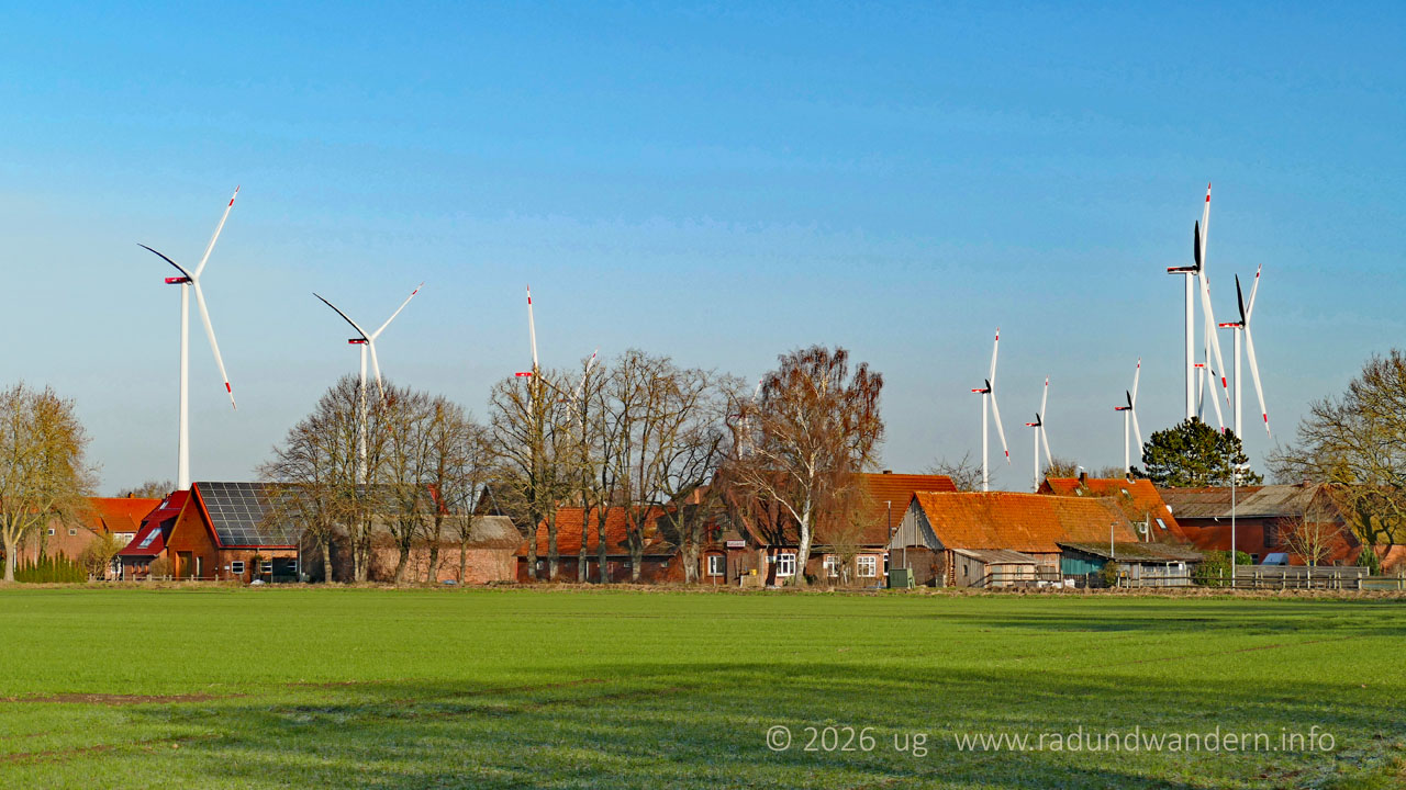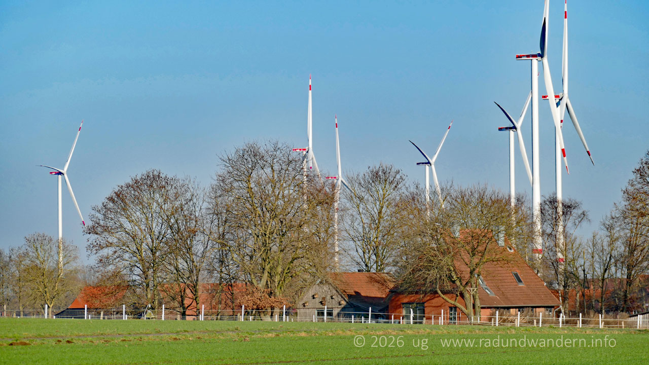 Harmissen auf der Geesthöhe ist eine Streusiedlung, bestehend aus einigen Gehöften und Häusern. Bei einer Biogasanlage biegen wir rechts ab. Die Anlage hat eine Waage, die wir gleich mal ausprobieren: 160 kg? Meine Frau steigt von der Waage. Es bleiben 100 kg. Das kann doch nicht sein?! Ach ja, die ist ausgelegt für Gewichte ab 400 kg. Na also, da kann ich das Abspecken ja noch aufschieben.