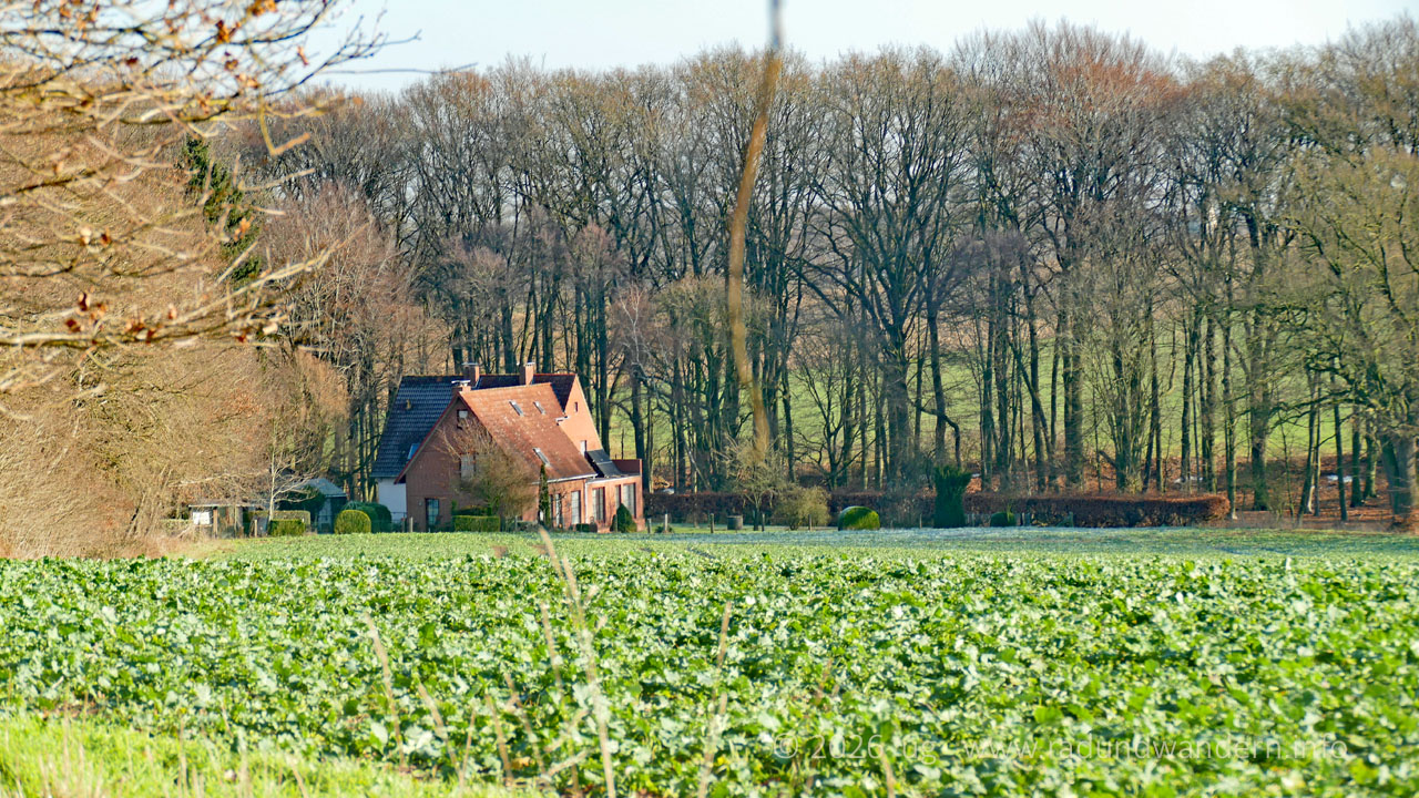 Wir bleiben vorerst auf der Höhe. Das beschert uns immer neue Ausblicke auf Süstedt und über die Eiter-Niederung. Nachdem wir die Harmisser Straße überquert haben, folgen links mit viel Liebe zum Detail restaurierte Gebäude eines kleinen Gehöfts.