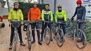 Nach der Pause erstaunte Blicke zum Himmel. Dicke Wolken brauen sich im Westen und Norden zusammmen. Erst scheint sich das vermeintliche Regengebiet nach Osten abzusetzen. Doch weit gefehlt. In Uenzen beginnt es zu schneien, erst leicht, dann dicht und mit dicken Flocken. Sicht zeitweise gegen null, Wind von vorn, Schnee auf der Brille, den Armen. Brille ab, Flocken in den Augen. So kämpfen wir uns stur Richtung Syke, immer den Wind von vorn, ab und zu unterbrochen in Süstedt und Wachendorf. So sind wir froh, als wir es die letzten Meter hinunter anch Steimke rollen lassen können. Kaum in Syke, hört der Schneefall auf, und die Sonne kämpft sich wieder durch die Wolken. Den ganzen Nachmittag dann wieder strahlend blauer Himmel!