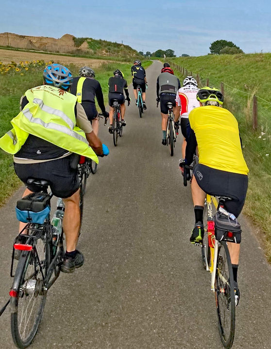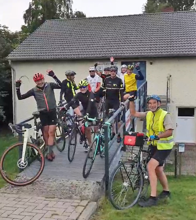 Das Wetter spielt während der Tour noch mit. Neun RRs starten bei knappen 20 Grad und leichtem Südwestwind zu einer Runde über Brinkum. Auch die Sonne tut sich etwas schwer, wie wir, weil es gleich vom Start weg bergauf geht.