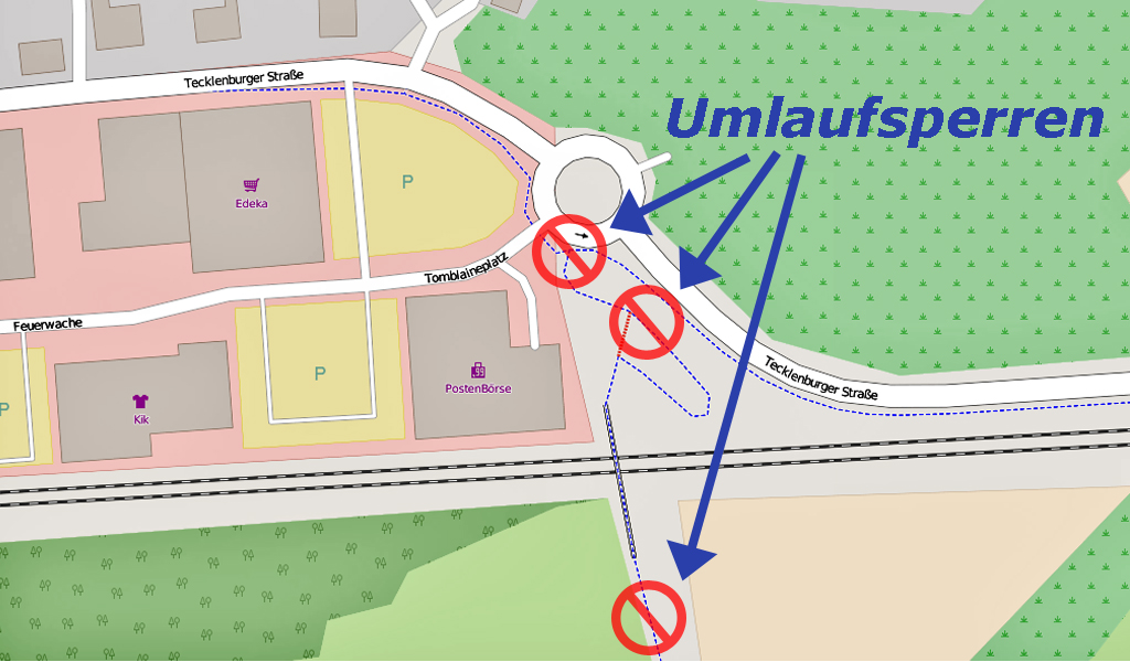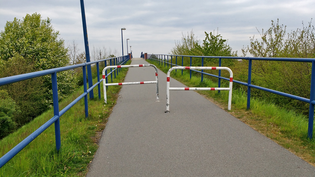 - "Mit den Umlaufsperren soll die Nutzung der Fußgängerbrücke durch motorisierte Zweiräder / Motorroller verhindert bzw. deren Geschwindigkeit reduziert werden. Die Umlaufsperren sind in der Form eingebaut worden, dass die Durchfahrt von Rollstuhlfahrern möglich bleibt, jedoch nicht jedes (motorisierte) Zweirad (Tandem, Fahrrad mit Anhänger) diese durchfahren kann. Im Rahmen der Abwägung zum Schutz der Fußgänger darf eine gewisse Abstand nicht überschritten werden, um auch das Ziel einer Geschwindigkeitsreduzierung zu erreichen."