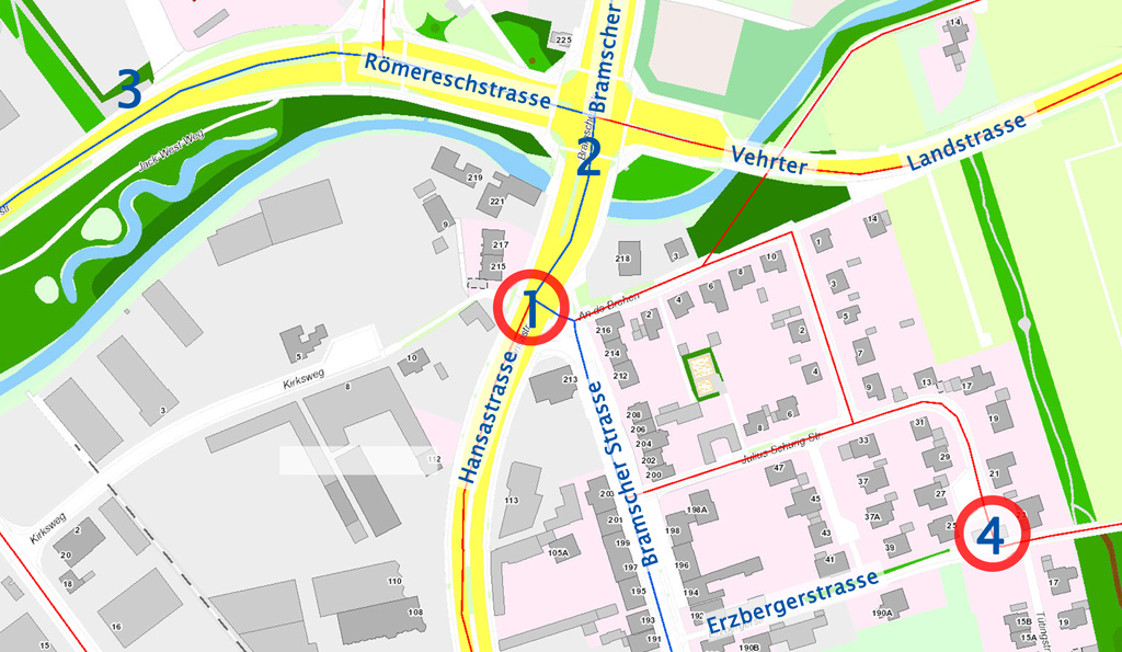 Punkt (1) in der Karte: Es ist und bleibt ein Skandal: Wer mit dem Fahrrad stadteinwärts in die Bramscher Straße abbiegen will, muss zusehen, wie er über die vierspurige Straße kommt. Eine Querungshilfe sucht er hier vergebens. Daran hat sich auch nach dem Ausbau der Römereschstraße nichts geändert. Während dort modernste Technik eingesetzt wird, um die Grünphasen zugunsten der Radfahrer zu steuern, soll hier eine LSA, die mit der Anlage an der Kreuzung Römeresch-/Hansastraße gekoppelt ist, technisch nicht machbar sein.