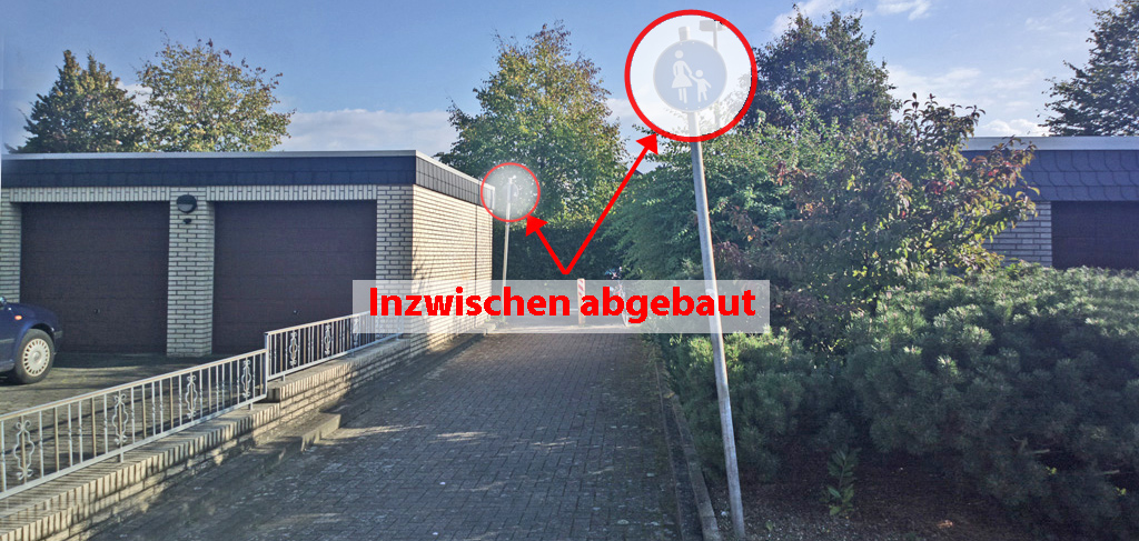 Punkt (4) in der Karte betrifft das Sekundärnetz für den Osnabrücker Radverkehr. Es sieht vor, dass Radfahrer von der Bramscher Straße oder von dem Radweg an der Nette her kommend durch die Straßen 'An de Brehen' und Julius-Schurig-Straße auf die Erzberger Straße fahren. Kurioserweise stand vor der Verbindung zur Erzberger Straße das Verkehrsszeichen 239. Es sagt aus, dass dieser Weg Fußgängern vorbehalten ist. Radfahrer hätten also auf ihrem eigenen Radfahrnetz absteigen und ihr Gefährt schieben müssen, natürlich bei gebotener Rücksichtnahme auf die fußläufigen Mitmenschen. Hier sind inzwischen die Schilder abgebaut worden. Einfach zu erledigende Anliegen werden von der Stadt dann doch meist schnell erledigt.
