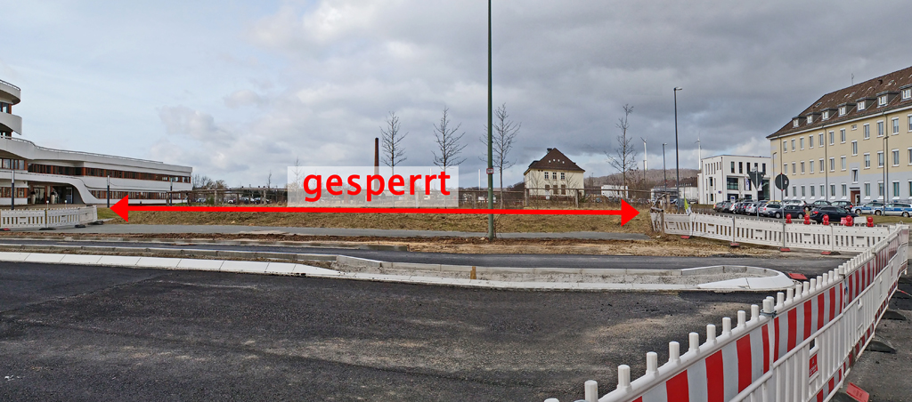 Bei Punkt (3) handelte es sich um ein vorübergehendes Problem, das sich nach dem Umbau der Römereschstraße erledigt hätte. Der asphaltierte Weg zwischen Polizeigebäude und dem Eingang zu den Grünanlagen (Kaffeepartner) war mehrfach abgesperrt. Wir wollen an dieser Stelle mal positiv hervorheben, dass der Baustellenbereich nahezu unterbrechungslos mit dem Fahrrad befahren werden kann. Es gibt sogar eine Radfahrerfurt auf die andere Seite in Richtung Polizeigebäude. Aber in den Grünstreifen Richtung Keffeepartner kam man von dort nicht. Inzwischen wurden die Sperrgitter tatsächlich längs des Straßenrandes aufgestellt. So kann man den Abschnitt nun wieder problemlos passieren.