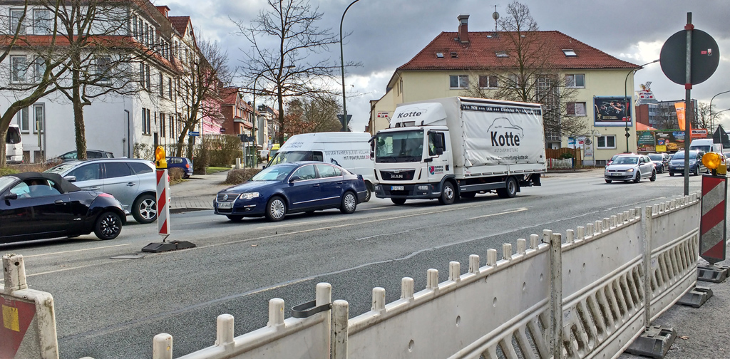 Fußgänger konnten bisher an der Kreuzung Haster Mühle (B68) die Ampel nutzen und schon vorher die B68 sicher überqueren. Das ist zur Zeit aber auch vorbei. Der Ausbau der Römereschstraße ist in den Kreuzungsbereich vorgedrungen. Die Ampel auf der stadteinwärtigen Seite ist abgeschaltet, der Übergang ist versperrt. Fußgänger werden mit einem dezenten Schild schwarz auf weiß nach rechts verwiesen. Und die Radfahrer, die aus der Römereschstraße kommen? Sie alle dürfen jetzt an der Hansastraße ihren Weg im Verkehrslärm und -gestank fortsetzen. Oder sie müssen sich in Gefahr begeben und hoffen, dass die Doppelschlange, die am Ende der Hansastraße gnädigerweise einen Zwischenstopp einlegt, auch solange dort bleibt, bis sie die andere Straßenseite erreicht haben.