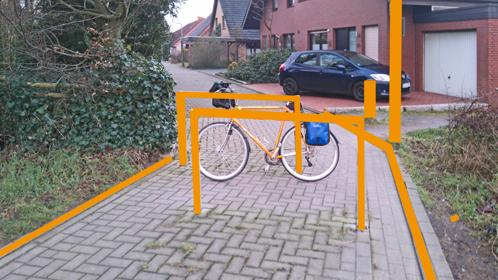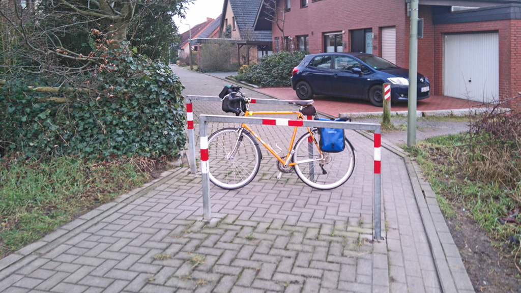 Umlaufsperren sind ja ohnehin ein Relikt aus Zeiten, da man Radfahrer nicht zu den Verkehrsteilnehmern zählte, sondern sie für eine etwas schnellere Variante von fußläufig sich fortbewegenden Menschen hielt, die von Verkehrsregeln keine Ahnung haben. Nur so ist zu verstehen, warum man überhaupt auf die Idee gekommen ist, rollenden Fahrzeugen Hindernisse in den Weg zu bauen, die dazu zwingen, den fließenden Bewegungsablauf zu unterbrechen. An wirklich gefährlichen Stellen mag noch eine gewisse, winzig kleine Berechtigung bestanden haben. Aber an der hier gezeigten Stelle ist nicht die geringste Gefahrensituation zu erkennen.