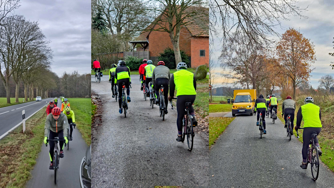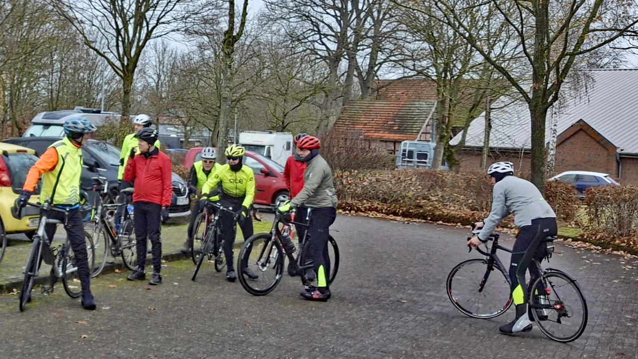 9 RRs am Start, Wetter spielt mit: Trocken, kaum Wind, ein bisschen Sonne. Gegen die Temperaturen unter 10 Grad können wir uns warm fahren.