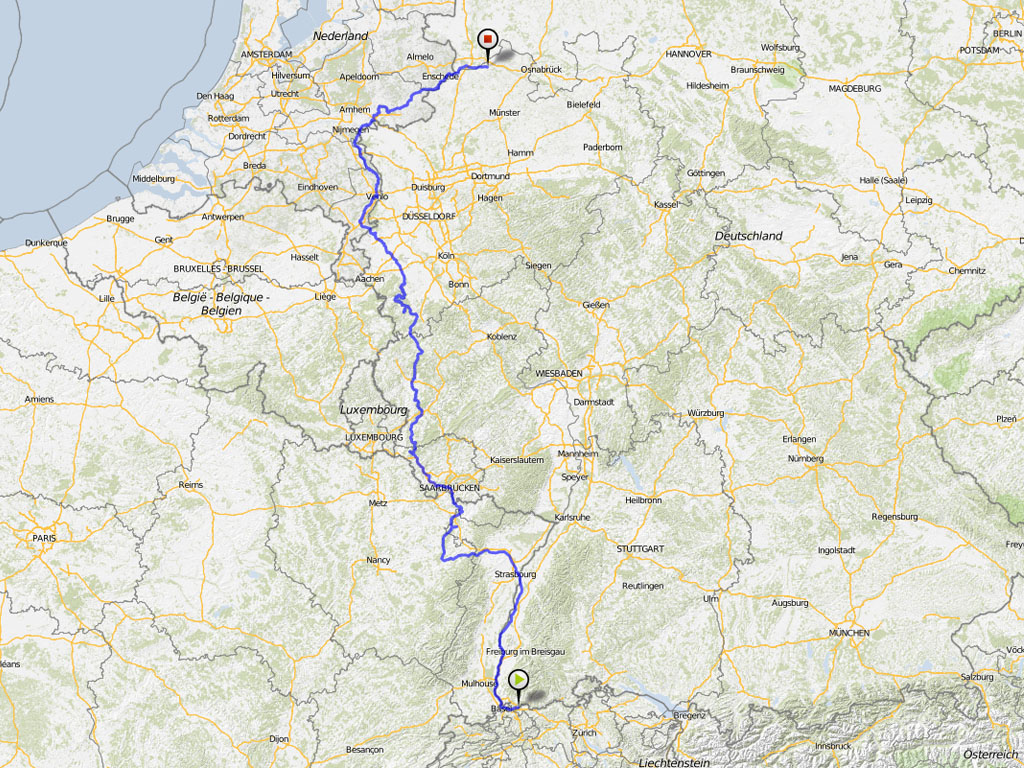 Bahn von Osnabrück nach Chur (ICE 105). Der Start in Chur verlängert die Route um gut 300 km oder um 4-5 Tage.