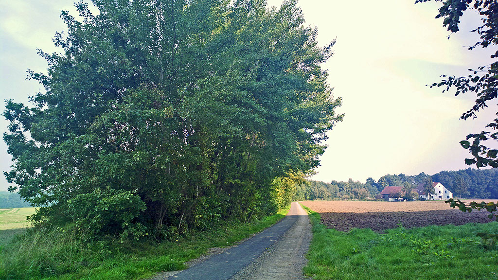 Bis Werther ist die alte Trasse in der Landschaft aufgegangen, auf jeden Fall gibt es keinen Weg, der sie nutzt. So kreuzen wir auf Wirtschaftswegen durch die Lande, bis wir auf der Schloßstraße landen.