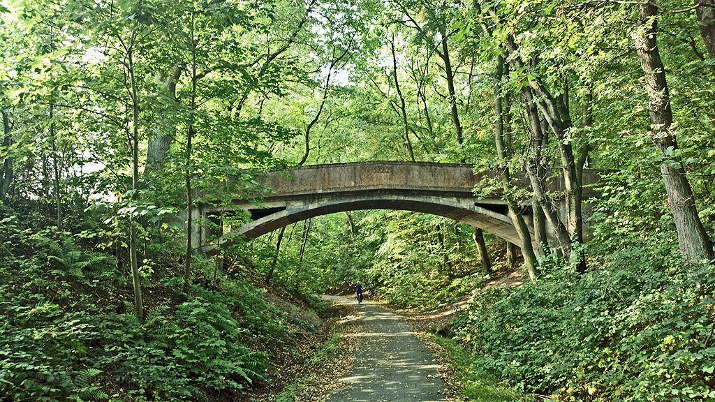 Diese kurze Tour führt vom Bahnhof Bünde über das Engeraner Kreisbahnmuseum nach Dornberg (Bielefeld) und weiter nach Werther auf den Spuren und Strecken der Bielefelder Kreisbahn. Hier ein Blick auf die alte Brücke von 1925 über den Taleinschnitt bei Pödinghausen.