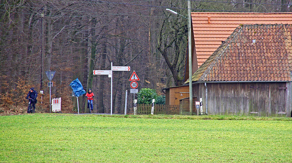 In Jöllenbeck ist abrupt Schluss mit lustig. Keine Bahntrasse, keine Schilder mehr. Ratlos landet man Im Hagen und schließlich an der Kreuzung Dorfstraße/Jöllenbecker Straße. Hier hilft nur eine gute Karte, unser GPS-Track oder Fragen. Letzteres haben wir gemacht, da wir ja noch keinen Track hatten. Die anfangs etwas verwirrenden Beschreibungen unseres offensichtlich sehr ortskundigen Auskunftgebers konzentrieren sich als Reaktion auf unsere ratlos bleibenden Gesichter schließlich auf folgenden Weg: Auf der Jöllenbecker Straße (kein Radweg!!!) Richtung Bielefeld bis zum "bunten Haus" (Skater-Zentrum) fahren, dort rechts in die Heidsieker Heide einbiegen. Dieser Straße bis zum Schnatsweg folgen und dort scharf links abbiegen. Man kann auch schon vorher links in den Wanderweg abbiegen. Er führt auch auf den Schnatsweg (kürzer aber schlechter Belag). Kurz bevor man wieder auf der Jöllenbecker Straße landet, rechts in die Neulandstraße abbiegen, am Ende in den Homannsweg nach links und kurz danach wieder rechts in die Straße Kückerwald. Dieser bis zur Jöllenbecker Straße folgen. Wer zu dieser Zickzack-Tour keine Lust hat, führt einfach die Jöllenbecker Straße durch bis zur Einmündung der Kückerwald-Straße. Achtung! Hier rechts und gleich wieder links in den Radweg parallel zur Jöllenbecker Straße einschwenken. Er bringt uns zur alten Babenhauser Straße am Kückerhof vorbei. Am Ende geht es rechts ab auf den viel zu schmalen Fuß-(Radfahrer frei-)weg an der Babenhauser Straße, den wir bis zur Bavostraße genießen dürfen (Vorsicht bei Gegenverkehr und Fußgängern!). In die Bavostraße links abbiegen, weg von den Hauptstraßen. Bis zum Ende fahren. Dort zweigt ein Fuß- und Radweg nach rechts ab. Er folgt mal wieder ein Stückchen der alten Bahntrasse bis zum Bahnhof Dornberg.