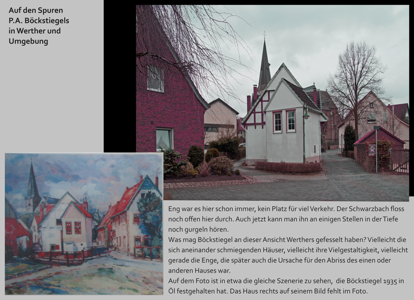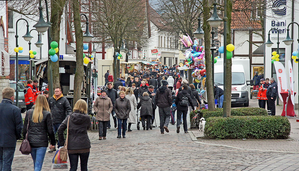 Die Schloßstraße führt uns direkt auf Werther zu und auf das letzte erhaltene Stückchen der Bahntrasse. Dazu biegen wir in den Talbrückenweg ein. Gleich hinter dem Wendeplatz beginnt die alte Trasse. Sie führt uns über die restaurierte Schwarzbach-Talbrücke auf den alten Bahnhof von Werther zu. Von dort steuern wir uns links haltend das Zentrum an, in dem bei unserem ersten Besuch ein buntes Treiben herrscht aus Anlass des "Frühlingserwachens".
