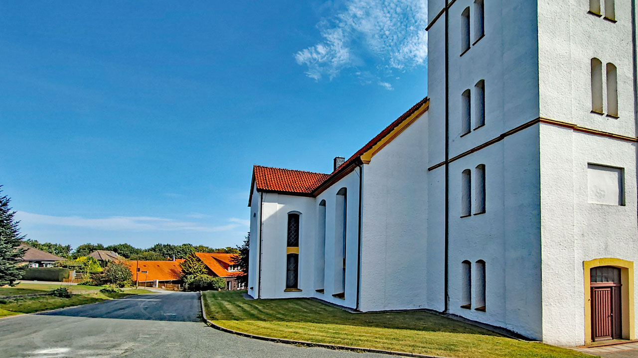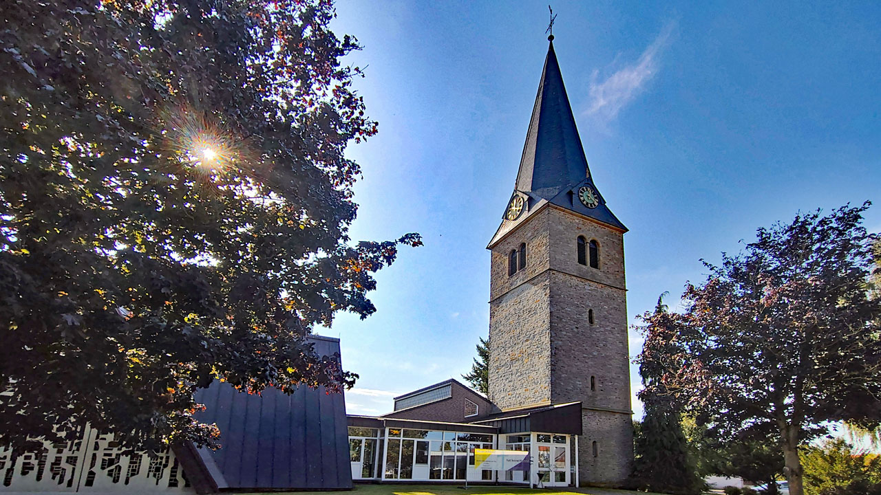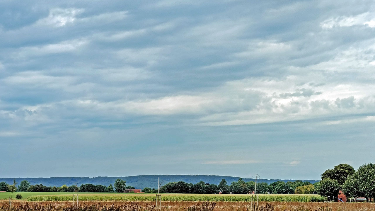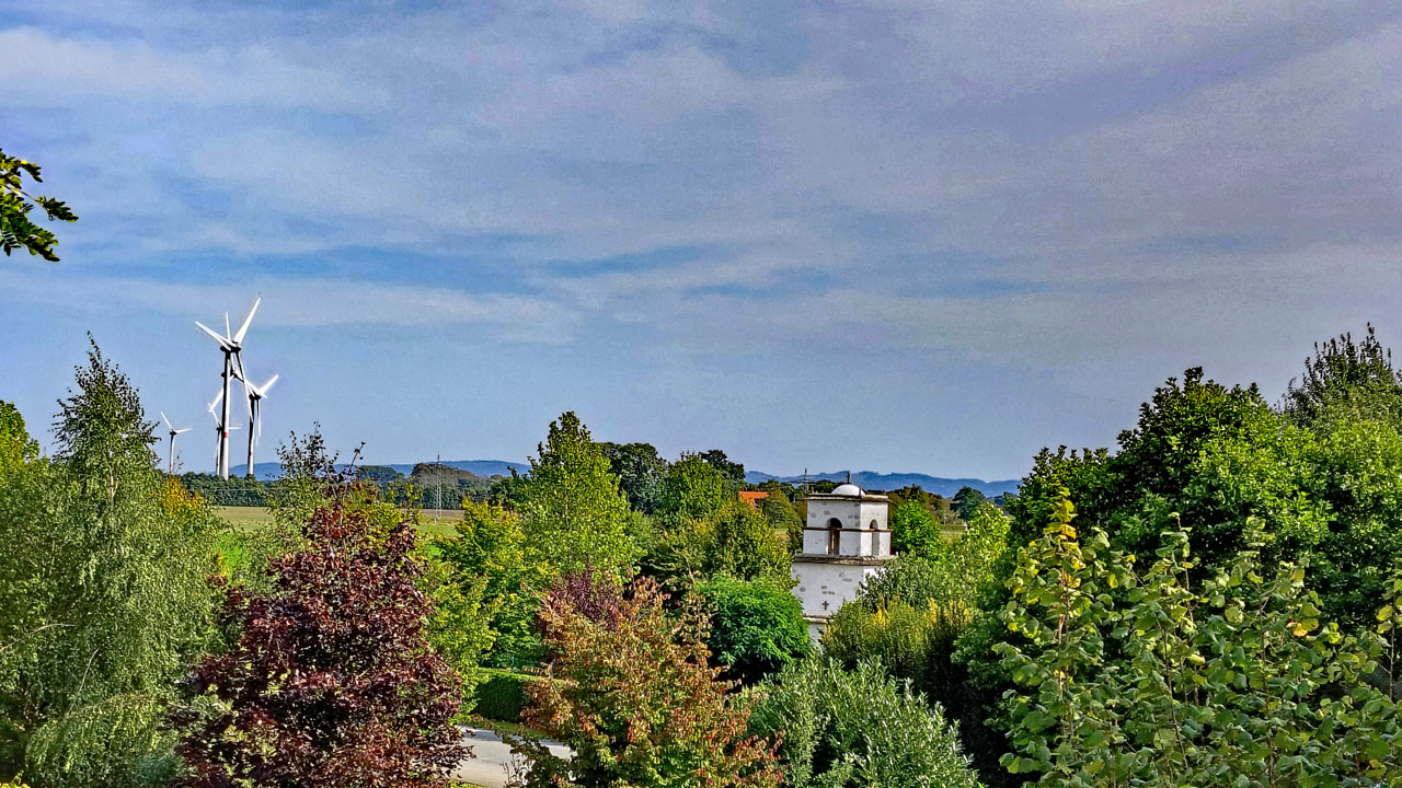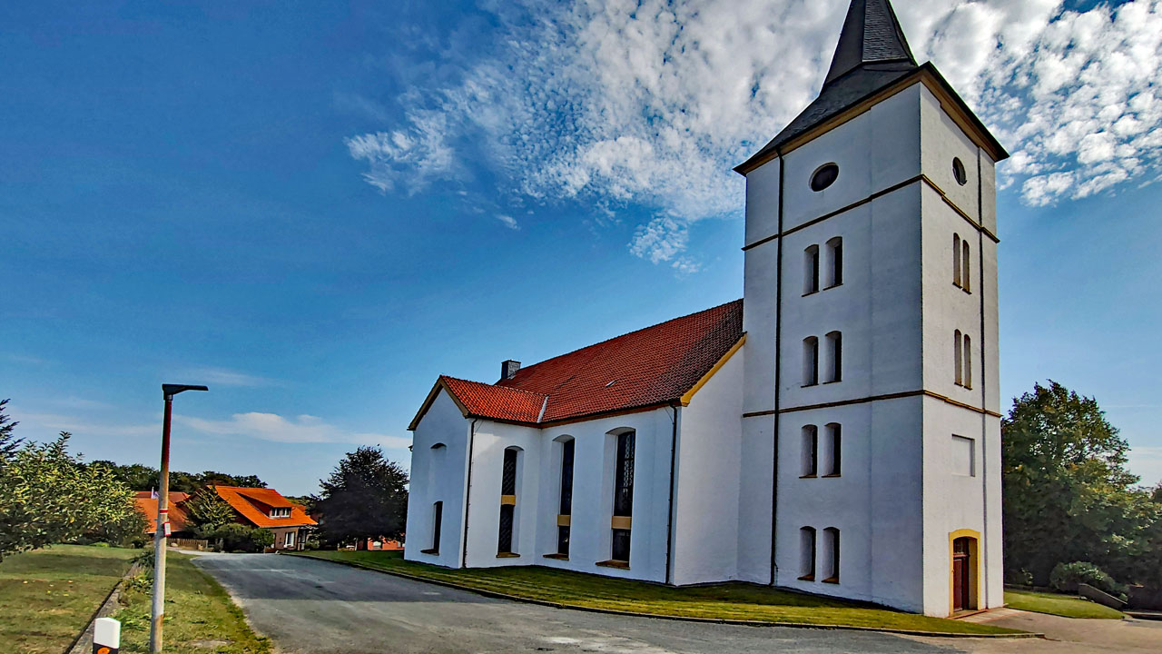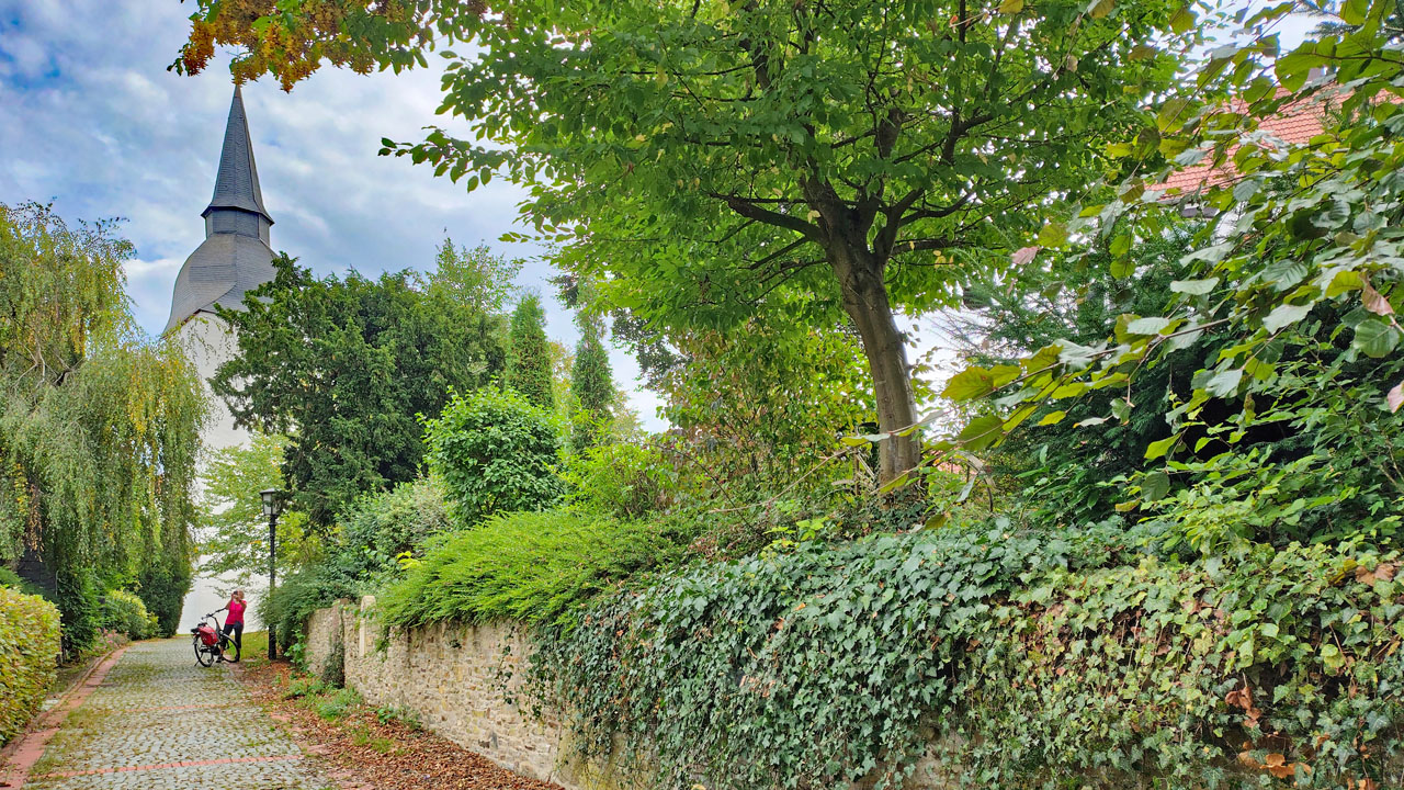 An der Kirche in Wehdem haben wir den vorerst höchsten Punkt der Tour erreicht und dürfen zur Belohnung die Blicke schweifen lassen bis zum Wiehengebirge. Auf der anderen Seite der Landesstraße, die den Ort duchschneidendet, liegt ein Supermarkt mit Bäckerei. Wer also noch etwas zum Futtern braucht oder seine Trinkflasche vergessen hat, der wird hier fündig.