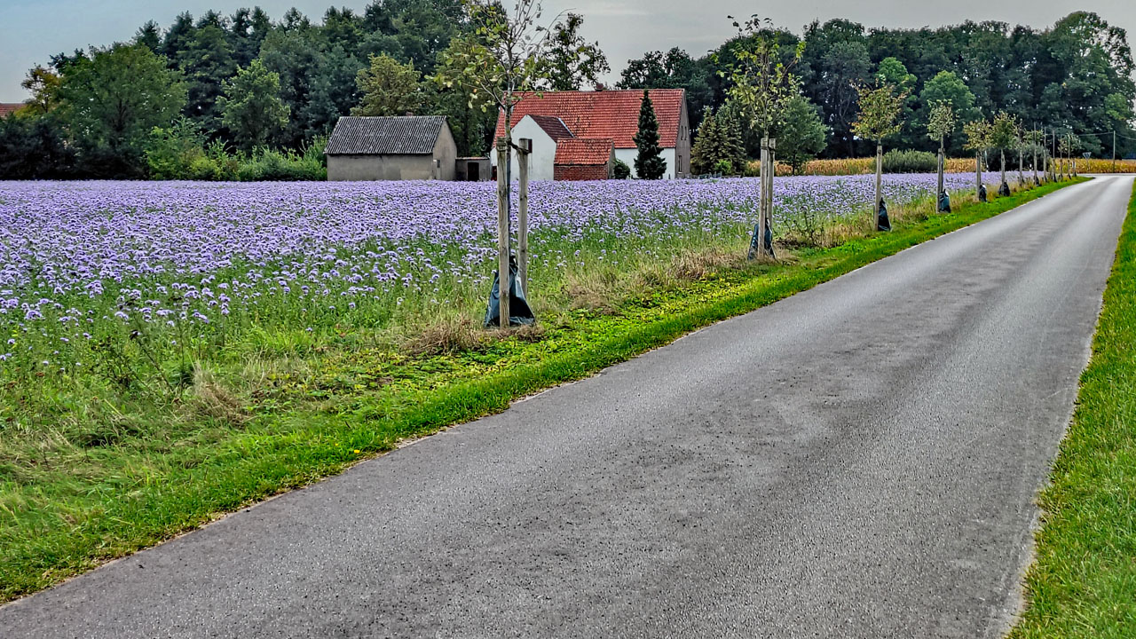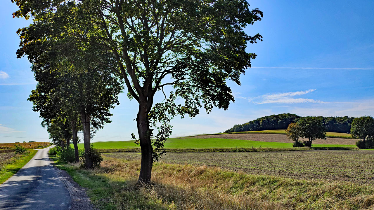 In Haldem fahren geradeaus wir die Landesstraße 765 und bekommen umgehend das kleine Gebirge zu spüren, das wir hier wieder erreichen. Wir wollen schließlich nicht unten auf der Hauptstraße im Verkehr radeln, sondern am Berghang entlang die Aussicht auf die leicht hügelige Ebene zwischen Stemweder Berg und Wiehengebirge genießen.
