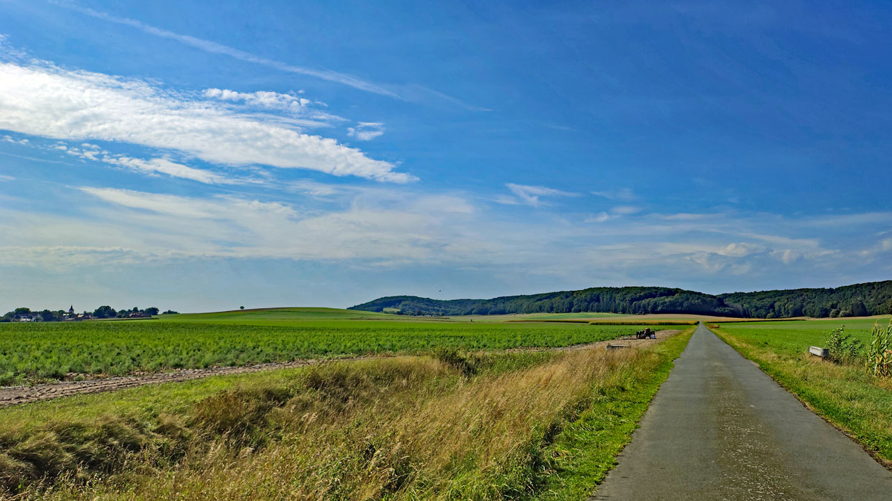 Nachdem wir den Ort und das anschließende Wäldchen hinter und gelassen haben, können wir uns so allmählich an die Umrundung des kleinsten Mittelgebirges machen. Das macht sich denn auch bald in den Beinen bemerkbar. Es geht stetig bergauf, dafür wird die Aussicht immer besser.