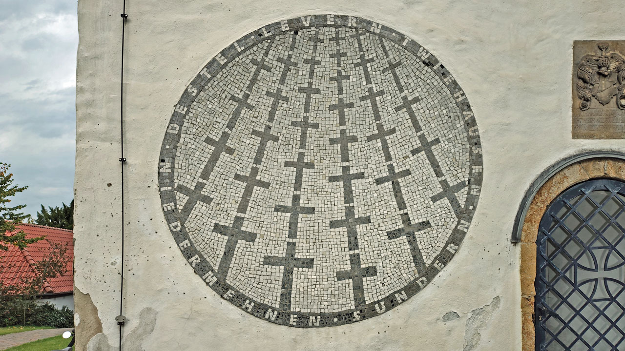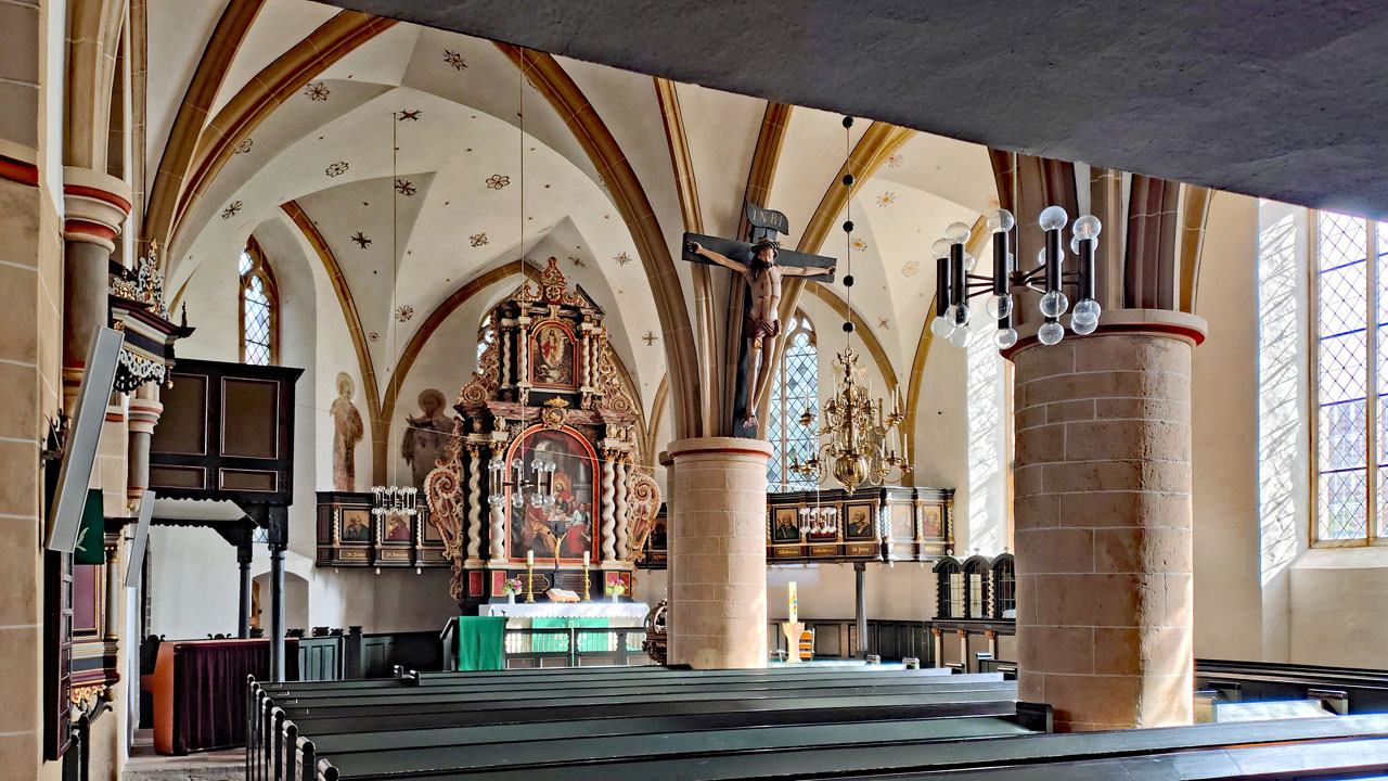 Wir sind also in Levern angekommen. Eine Allee, die Badeallee, führt direkt auf das Ortszentrum zu. An der Hauptstraße fahren wir ein Stückchen nach rechts, biegen gleich wieder links ab und bei nächster Gelegenheit noch einmal nach links in eine schmale Gasse. Sie bringt uns direkt auf den Stiftshügel hinauf bis zur Stiftskirche. Hier sollte man die Räder erst einmal stehen lassen und das Terrain zu Fuß erkunden. Die Kirche ist in der Regel tagsüber geöffnet und frei zugänglich.