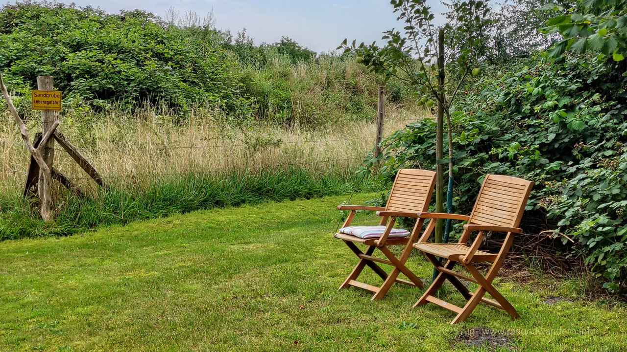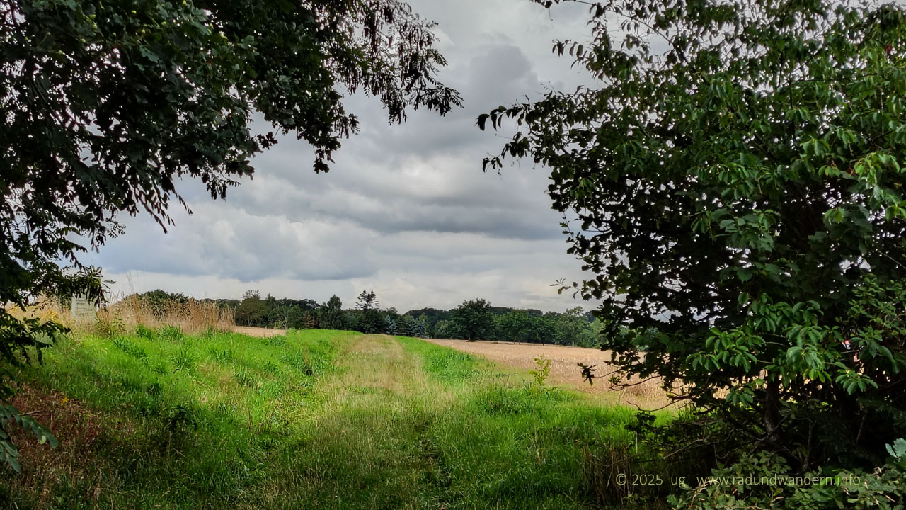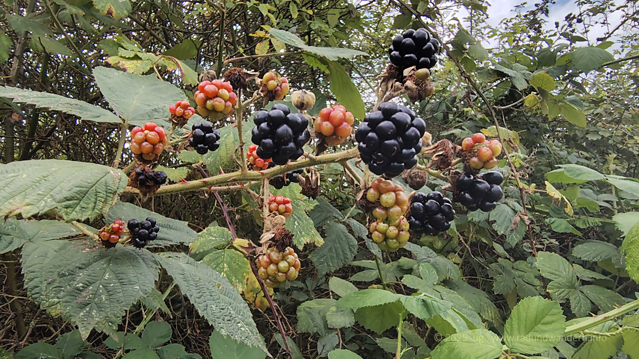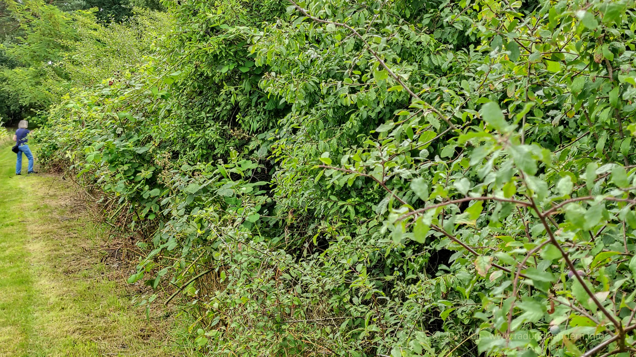 Ausgeruht überqueren wir schließlich die Bruchmühler Straße und laufen noch ein Stück durch den gegenüberliegenden Wald, bevor wir am Affendorfer Weg auskommen. Hier gibt es keine Alternative. Wir müssen Asphalt treten, bis rechts ein Pfad wieder in den Wald hinein führt. Der Weg lässt sich nur schwer beschreiben. Einfach dem Pfad folgen, der an der Sandgrube entlang führt und uns zu den üppigen Brombeergebüschen bringt. Juli = Brombeerzeit. Die Ranken hängen dieses Jahr übervoll mit ständig nachreifenden Beeren. Aber Vorsicht, nicht hinein fallen, nur die gut erreichbaren Beeren pflücken!