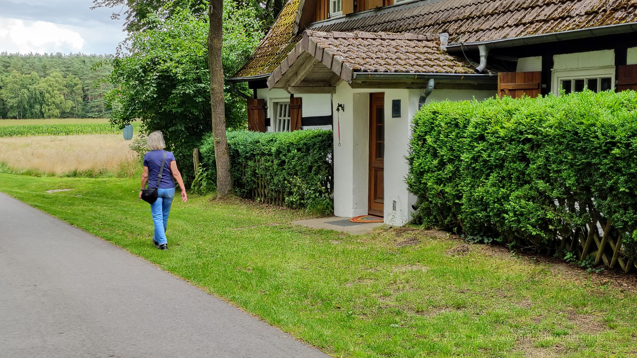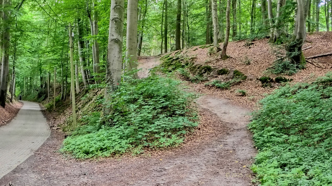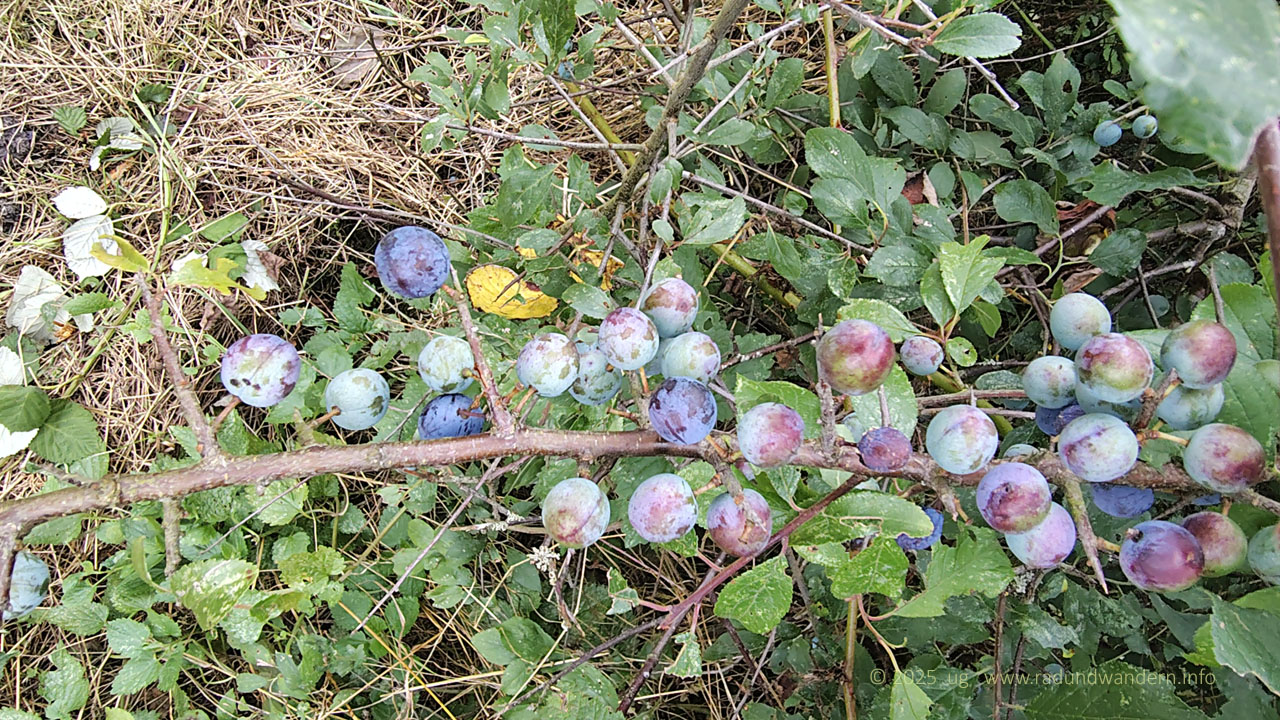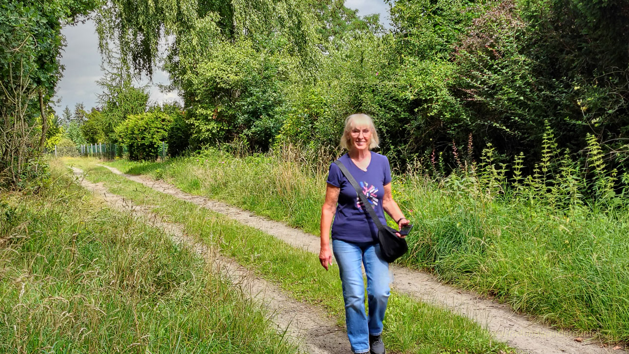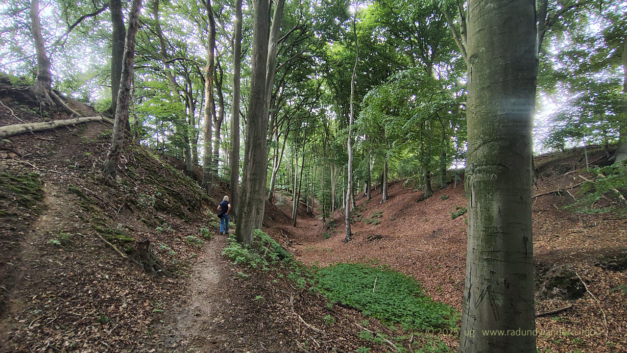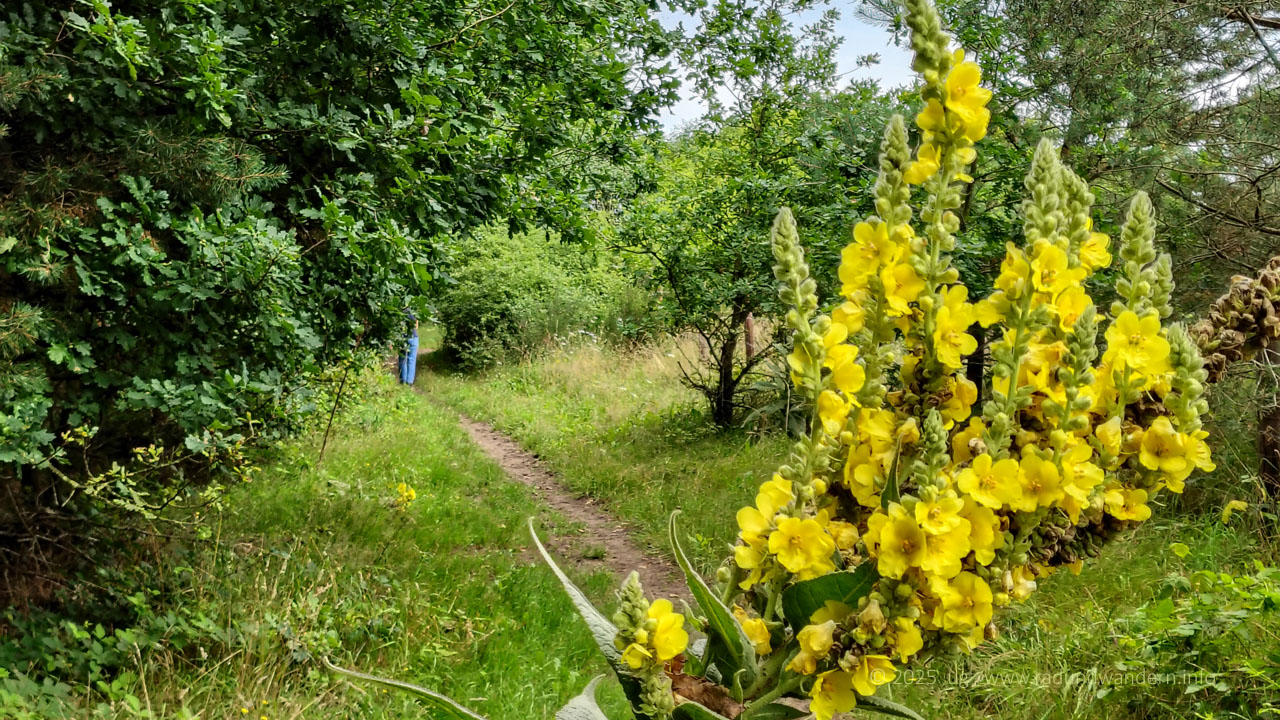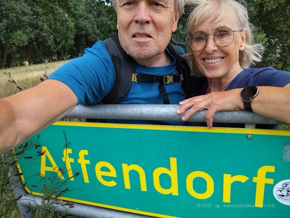 Wir waren schon einmal auf dieser Route unterwegs, und zwar im Januar 2024, die Bäume kahl, der Wind frisch und alle Wasserläufe bis oben hin gefüllt. Dieses Mal fahren wir das Kontrastprogramm, alles grün, laue Lüfte und Büsche voller Beeren. Die Route unterscheidet sich nur in zwei Punkten: Wir nehmen den Pfad durch das Rutental Richtung Affendorf und laufen von dort über Wöpse zurück. 2024 sind wir genau umgekehrt gegangen.