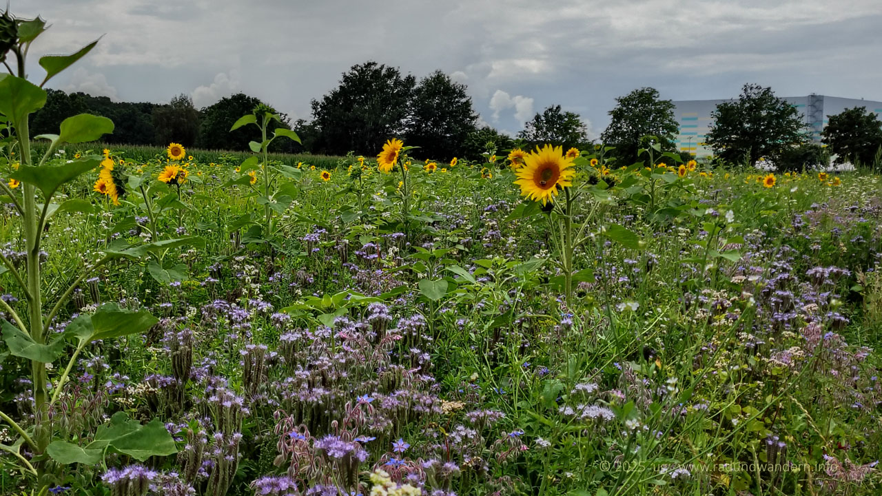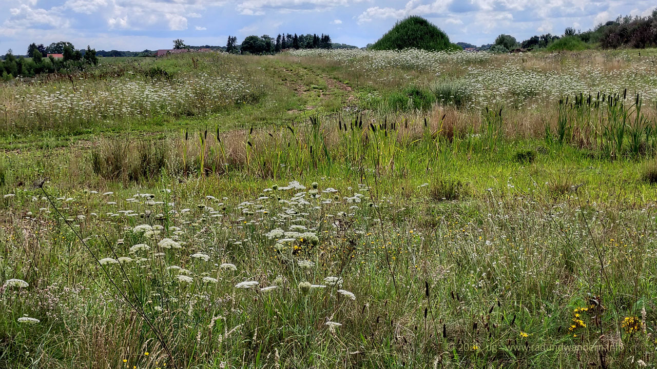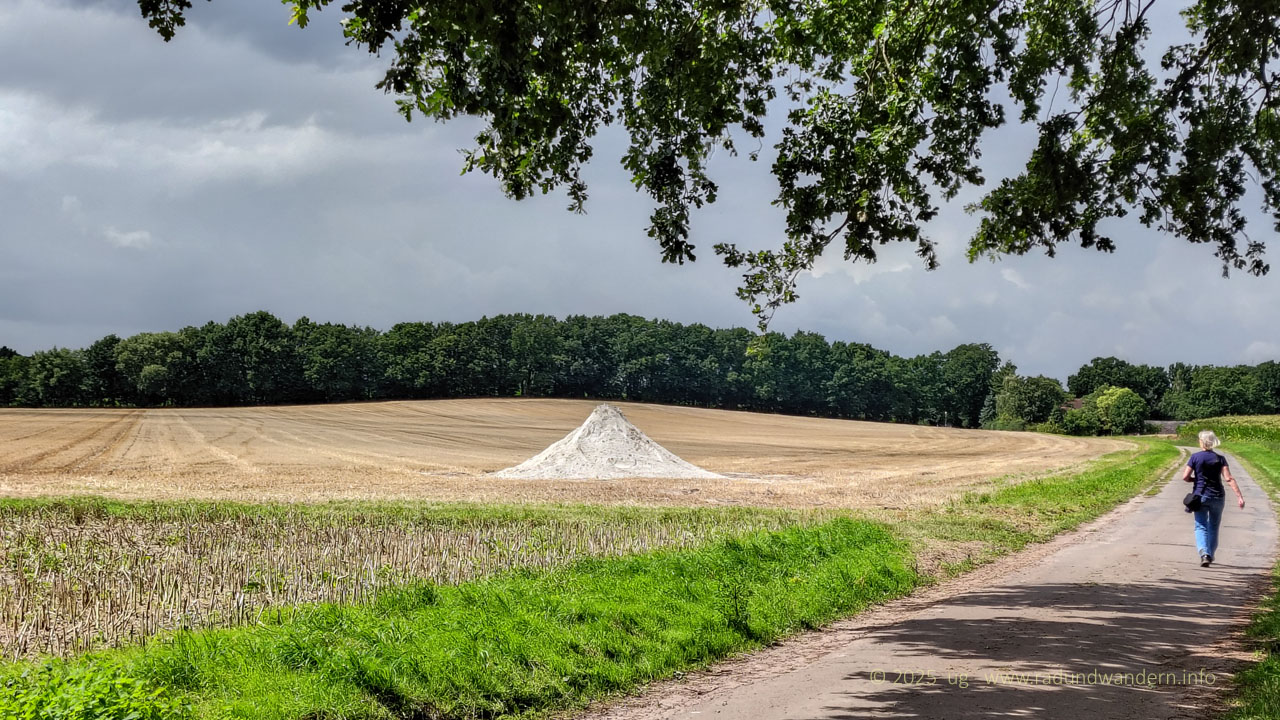 Der Rückweg beginnt in Wöpse auf einem schönen, ländlichen Weg, der genau in unsere Richtung auf Vilsen zu verläuft. Doch an einer Gabelung ist Schluss. Ideal wäre es, könnte man hier geradeaus weiter laufen. Doch vor uns verläuft der Wöpser Grenzgraben. Keine Brücke, also Umweg. Wir biegen links ab und landen schließlich auf einem Asphaltsträßchen, dem wir nach rechts folgen. Nun können wir auch den Wöpser Grenzgraben überqueren. Danach nehmen wir den zweiten Weg wieder nach rechts. Es geht eine Weile an einem Solarpark entlang. Der riesige Kasten, der sich schon eine Weile zunehmend in das Blickfeld schiebt, gehört zum Mineralwasser-Produzenten Vilsa und beherbergt ein Hochregallager.