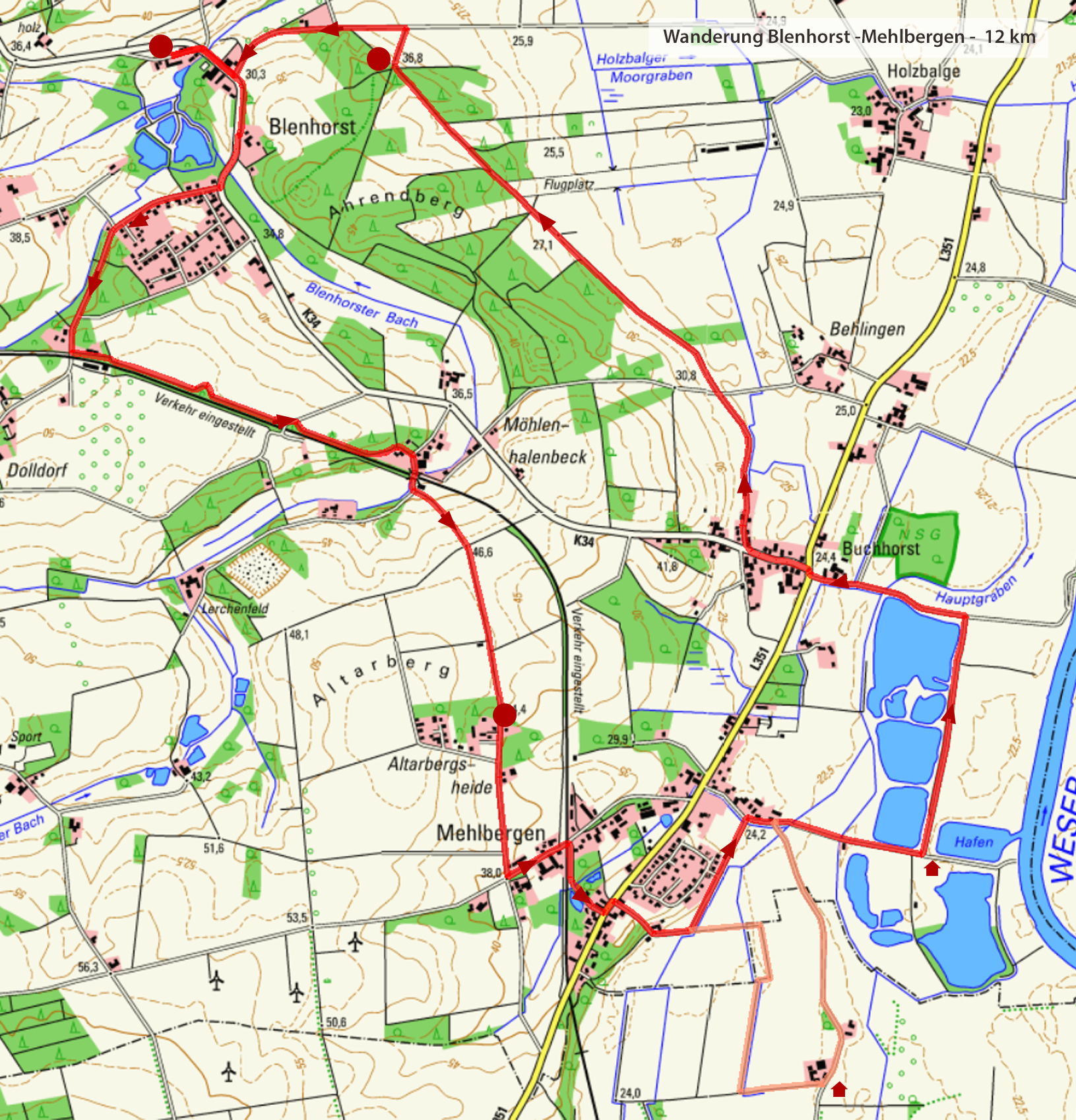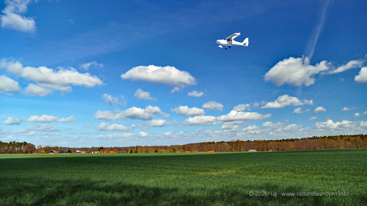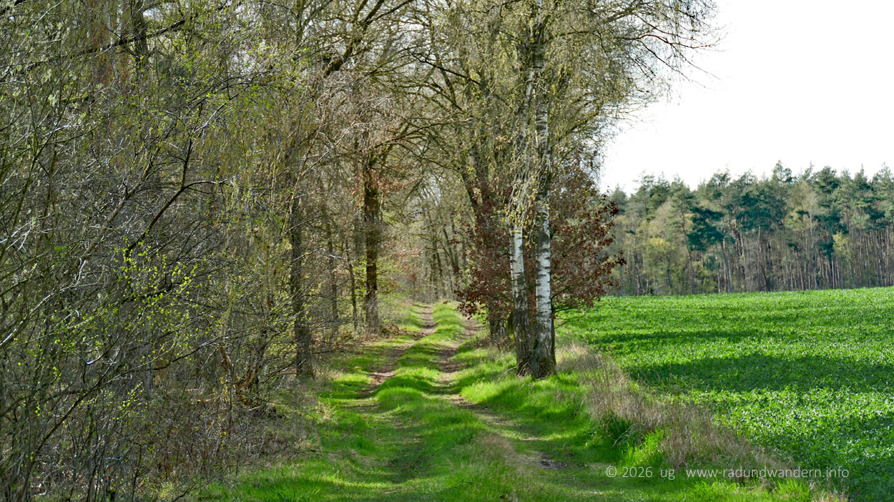 Für den Weg orientieren wir uns grob an der ehemaligen Bahnstrecke von Nienburg nach Sulingen, der wir auf dem Hinweg bis Mehlbergen ziemlich direkt folgen. Der Rückweg führt über den Ahrendsberg mit schönen Aussichten in die Wesermarsch.