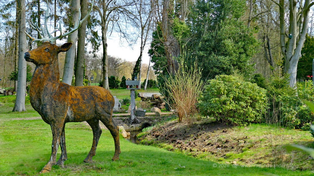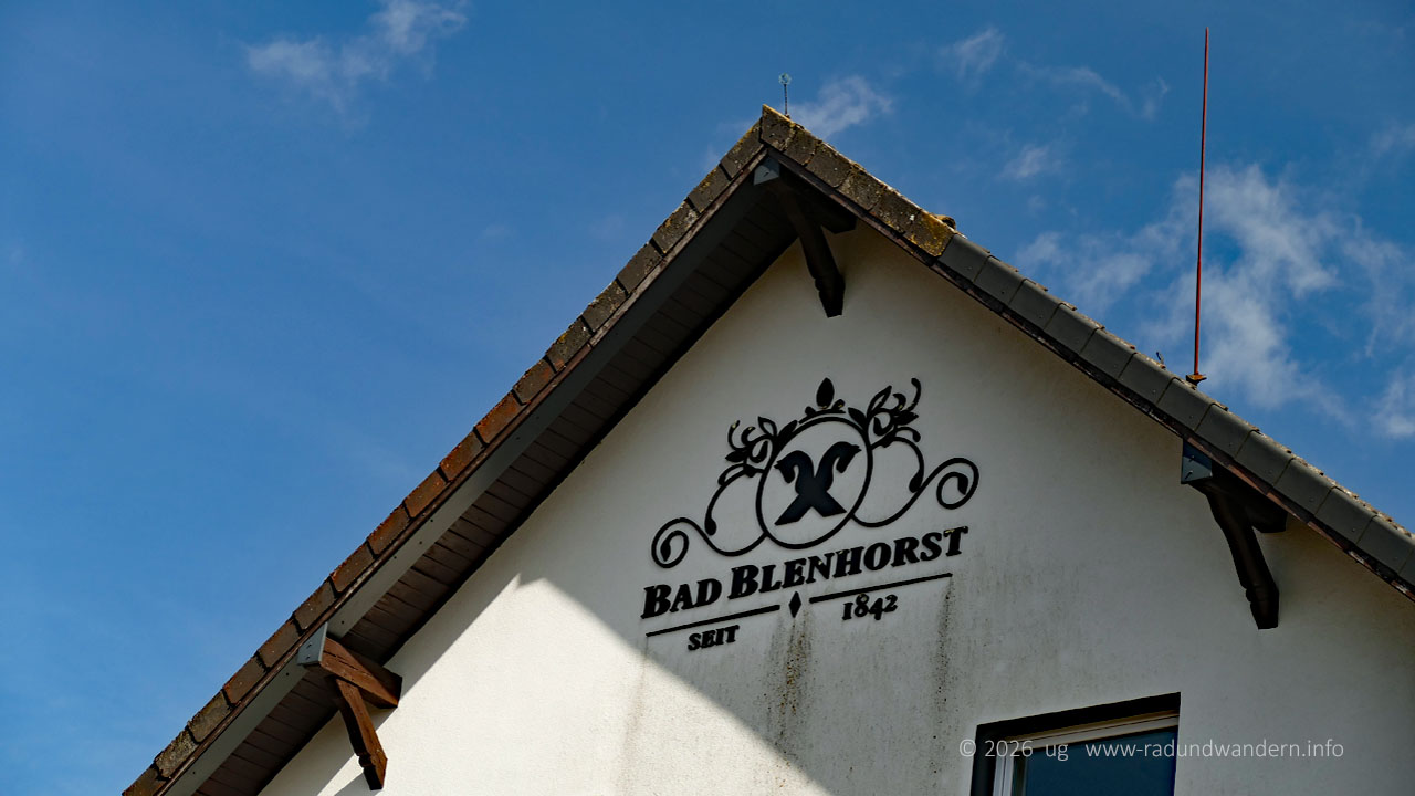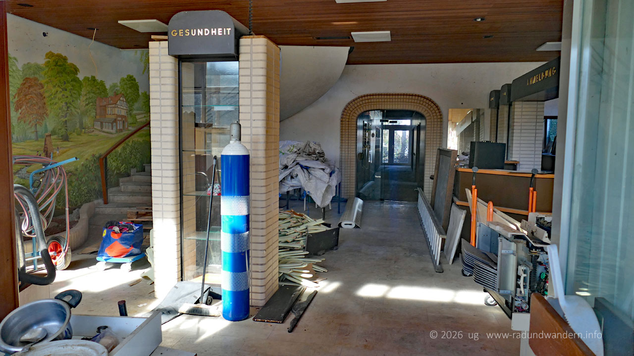 Unser Weg führt uns anschließend von der Mühle aus die Hauptstraße entlang. Kein Problem, da sie von einem Fahrradweg begleitet wird. Linkerhand steht das ehemalige Hotel des Moorheilbades Bad Blenhorst mit dem dahinter liegenden Kurpark. Der ist aber aktuell (2026) für Besucher geperrt. Rechts befindet sich das Kurmittelhaus. Wenn man einen Blick hinein wirft, sieht man, dass der Innenbereich recht modern gestaltet war. Diverse Maschinen und Werkzeuge lassen darauf schließen, dass hier jemand dabei ist, das Haus zu restaurieren.