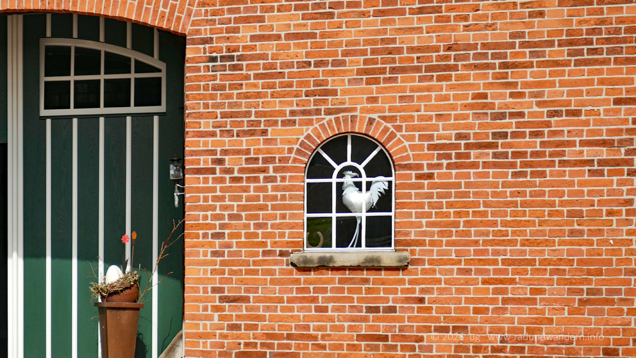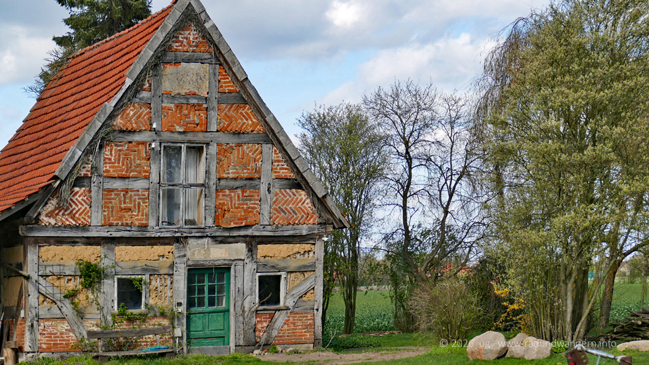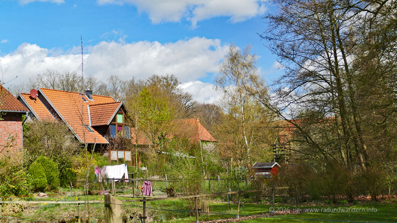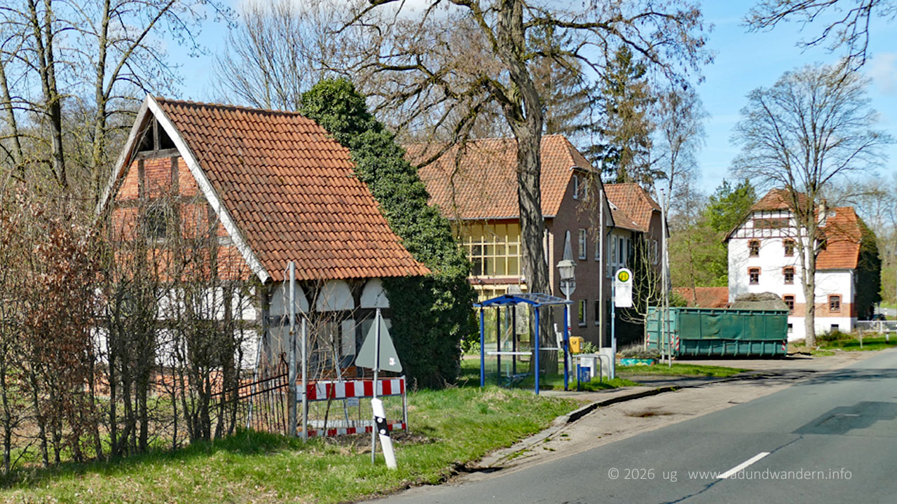 Nach dem Päuschen geht's weiter, wieder 'bergauf'. Bei der nächsten Kreuzung biegen wir links ab in die Bahnhofstraße. Manchmal erinnert wie hier nur noch ein Straßenname daran, dass hier mal die Eisenbahn Menschen und Güter in die Welt oder auch nur in die nächste Kreisstadt befördert hat. Auf jeden Fall sind wir in Mehlbergen angekommen und passieren mal wieder einen imaginären Bahnübergang. Linkerhand liegt der ehemalige Bahnhof. Wir biegen aber rechts ab und schauen uns Mehlbergen von hinten an. Nach Durchqueren einer Senke auf dem nur für Fußläufige und Radfahrende zugelassenen Fischteichweg erreichen wir oben angekommen die Kreisstraße von Marklohe nach Hoya. Schräg gegenüber verlassen wir die Hauptstraße allerdings gleich wieder. Hier befindet sich übrigens auch die Haltestelle, die regelmäßig von der Buslinie 20 von Nienburg aus angefahren wird.