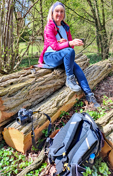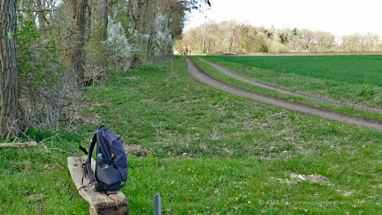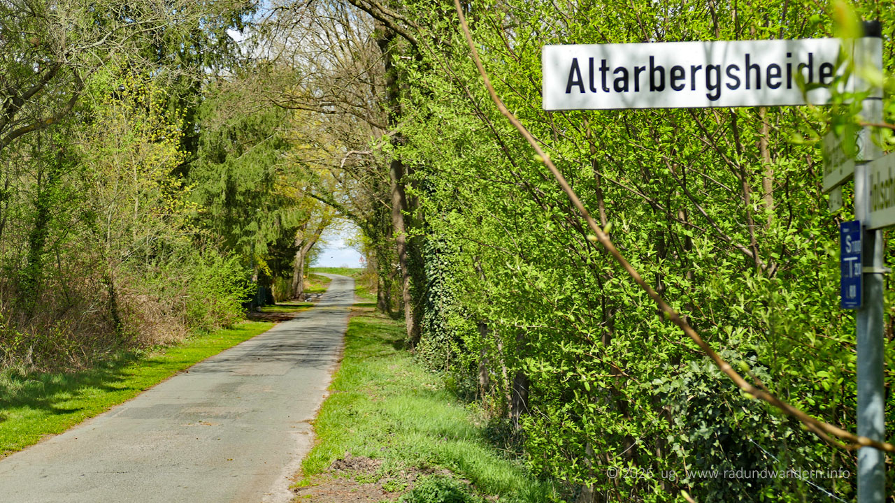Schotterweg. Durch die Felder erreichen wir in einer Senke die Ansiedlung Altarbergsheide. Die staubige Strecke hat unseren Durst geweckt und so lassen wir uns auf ein paar Baumstämmen nieder, um in Ruhe den Inhalt unseres Rucksacks zu inspizieren.