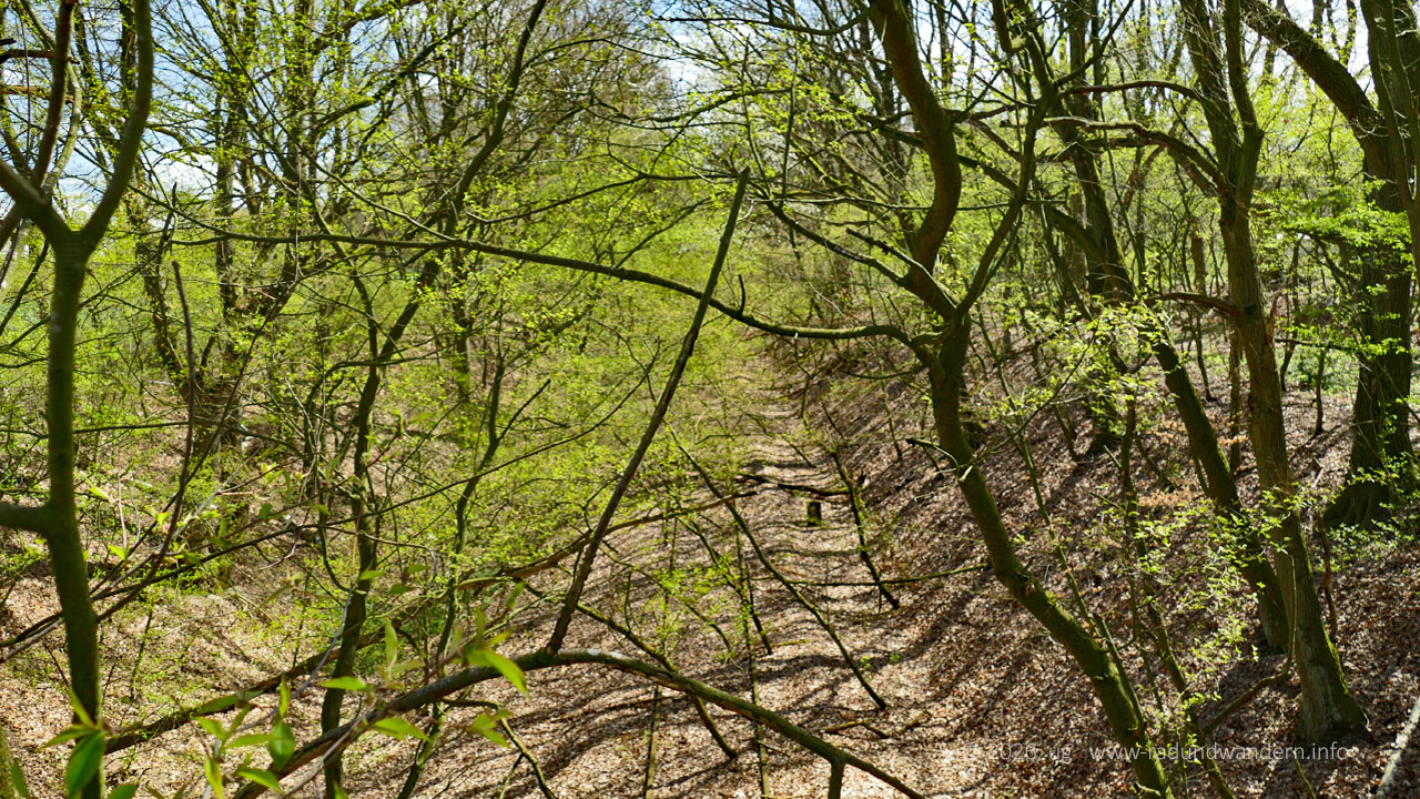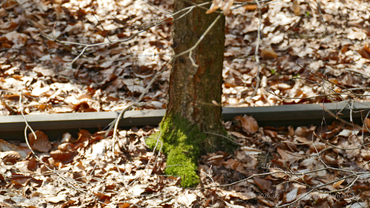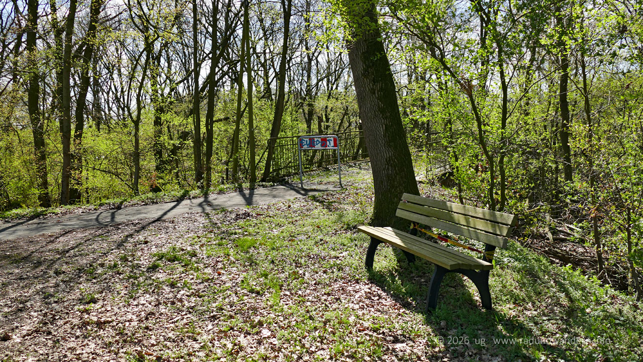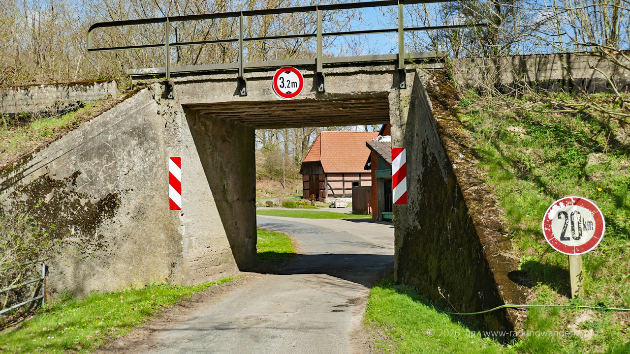 Unser Weg begleitet nun eine ganze Weile die Bahntrasse, die sich in einem Geländeeinschnitt versteckt. Unterwegs lädt die eine oder andere Bank zum Verweilen ein. Schließlich stoßen wir auf die Hofanlage Möhlenhalenbeck und unterqueren die Bahnstrecke. Für uns unsichtbar quert hier auch der Blenhorster Bach noch unter der Straße die Bahnunterführung.