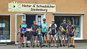 Gut gelaunt lassen wir uns von der freundlichen Bäckersfrau fotografieren, bevor wir wieder gen Heimat aufbrechen. Es geht durch den Ort Richtung Sulingen. Da wollen wir aber nicht hin, sondern biegen am Ortsende rechts ab, um erneut auf langen Geraden nordwärts zu fahren. Vorbei an Brake, Wohldheide und an der Hachequelle gelangen wir nach Engeln. Von hier führt uns der Weg weiter nörwärts über Weseloh zurück nach Heiligenfelde. Von geht es dann auf gewohnten Wegen zurück nach Syke.