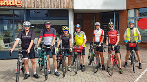 Sieben Rennradler machen sich bei leicht durchwachsenem Wetter mit Sonne und Wolken auf den Weg nach Thedinghausen, dem Wind entgegen, der schwach aus Nordost bläst.