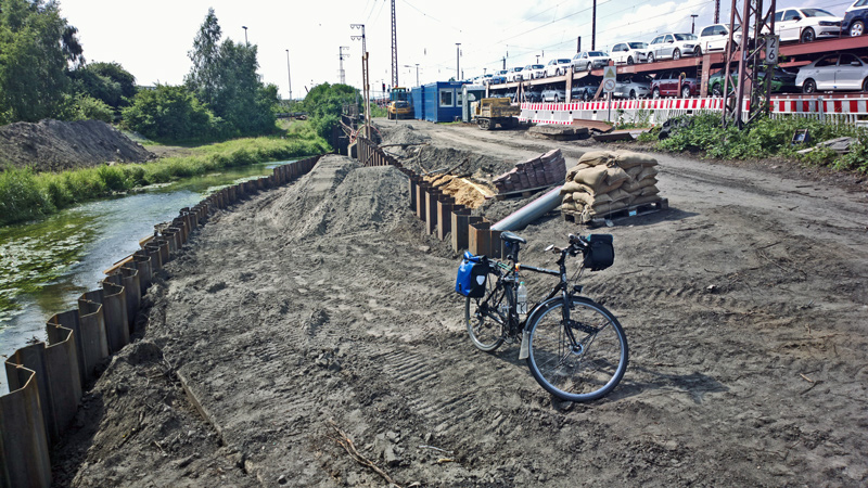- Bessemerstraße: Hier wird der Weg sogar für eine Fabrikzufahrt unterbrochen. Manchmal parken dort LKW direkt vor dem Haseuferweg.