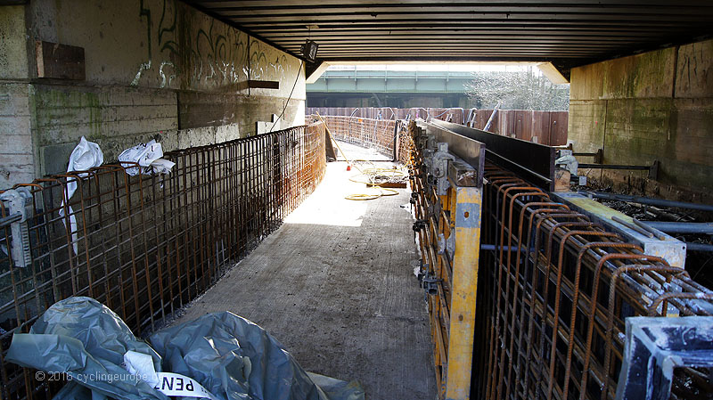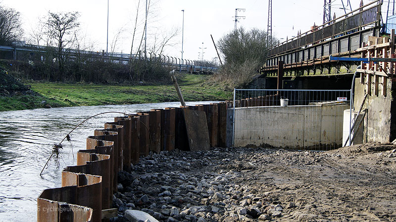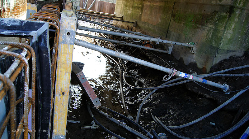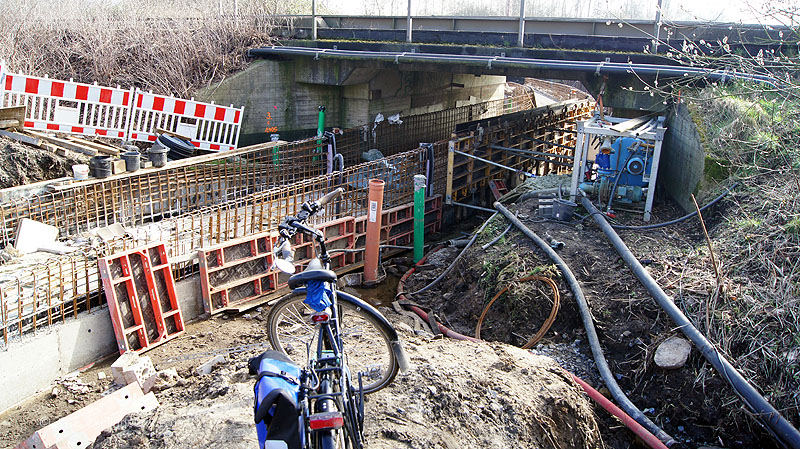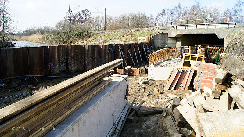 Die Trogstrecke unter Bahn hindurch ist im Bau. Damit wird der Weg frei für weitere flussnahe Abschnitte Richtung Bifurkation. Hier sieht man ja bekanntlich bisher auf weiten Strecken nichts von der Hase. Im Januar hieß es im Interview des ADFC mit Stadtbaurat Otte: "Wesentlicher Bestandteil (...) ist die Unterquerung der Bahnstrecke. Dafür wird eine sogenannte Troglösung im Zeitraum April - Dezember 2015 gebaut. Im Anschluss werden die Wege radfahrtauglich hergerichtet." Der Fertigstellungs-Termin ist geplatzt. Aktuell (2016-02-26) sind noch nicht einmal die Betonierungsarbeiten abgeschlossen. Der Trog befindet sich in weiten Teilen also noch im Rohbau. Immerhin wird schon an den Zuwegungen gearbeitet. Es dürfte aber Sommer werden, bis alle Arbeiten abgeschlossen sind.