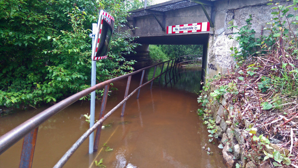 Während des Hochwassers Ende Juni war der Radweg freigegeben, obwohl die Unterführung bei Realkauf überschwemmt war.