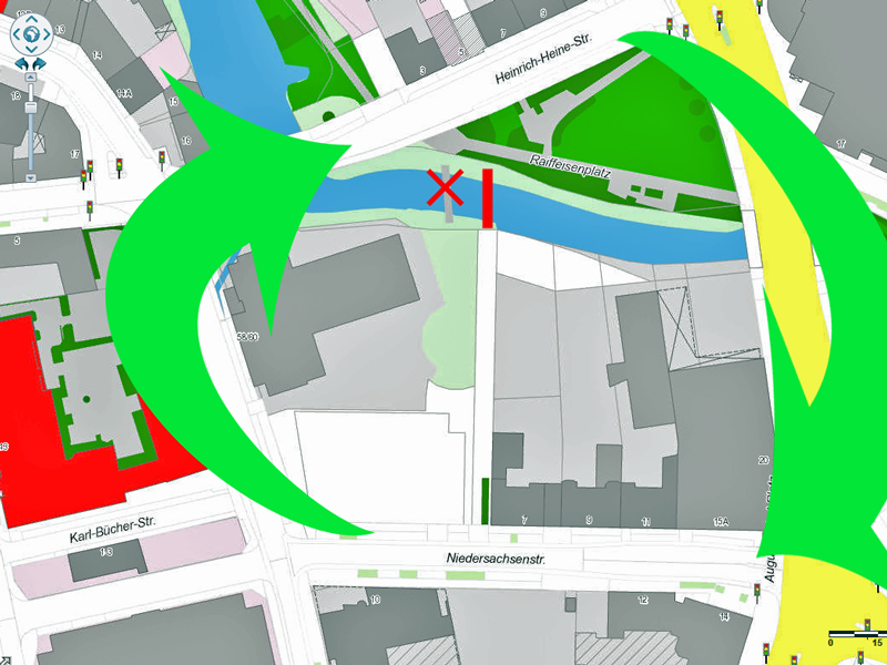 - Ab Schillerstraße geht es nur für Fußgänger weiter. Radfahrer müssen mit der zeitweise stark befahrenen Möserstraße vorlieb nehmen.