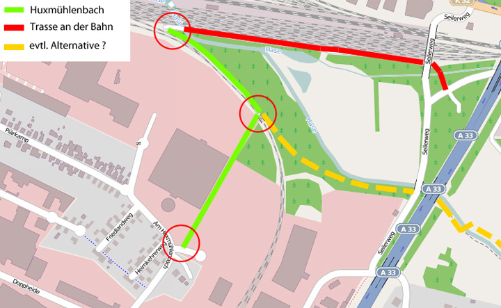Wir haben uns daher mit einem Alternativ-Vorschlag an die Stadtplanung gewandt und warten nun gespannt darauf, welche Variante realisiert wird. Eine Auskunft darüber haben wir bisher nicht erhalten. Wir hatten nämlich vorgeschlagen, damit eine Situation wie oben beschrieben gar nicht erst entstehen kann, den Radweg entlang des Belmer Baches parallel zur Straße bis zur Weiterführung des Haseuferweges am Umspannwerk anzulegen. Der Anstieg entfällt und die Querung findet an einer Stelle statt, die etwas mehr Sicherheit verspricht. Als weitere Vorsichtsmaßnahme müssen dann auf dem Heideweg in beide Richtungen rechtzeitig Warnschilder aufgestellt werden. Eventuell sollte man sogar über eine farblich abgesetzte Aufpflasterung an der Querungsstelle nachdenken, die dem Autoverkehr deutlich signalisiert, dass hier mit Querverkehr zurechnen ist.