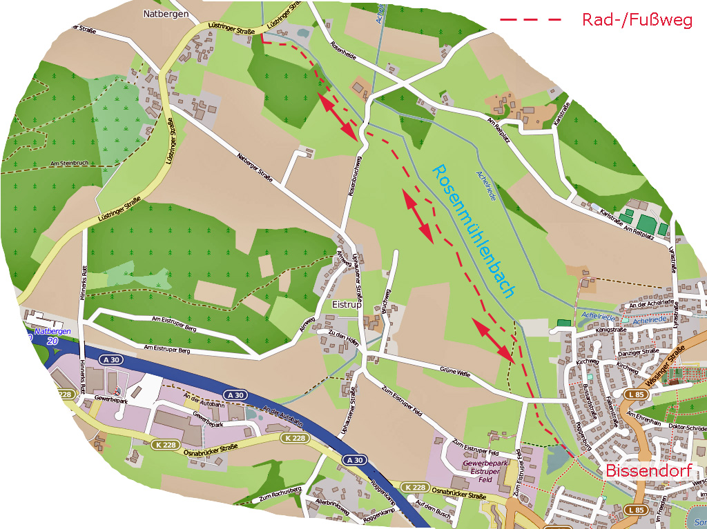 Bissendorf plant, die Rosenmühlenbach-Aue zu renaturieren. In dem Zusammenhang soll es auch einen Rad- und Fußweg entlang des neu angelegten Bachlaufes geben, der dann bis zur Lüstringer Straße geführt werden soll.