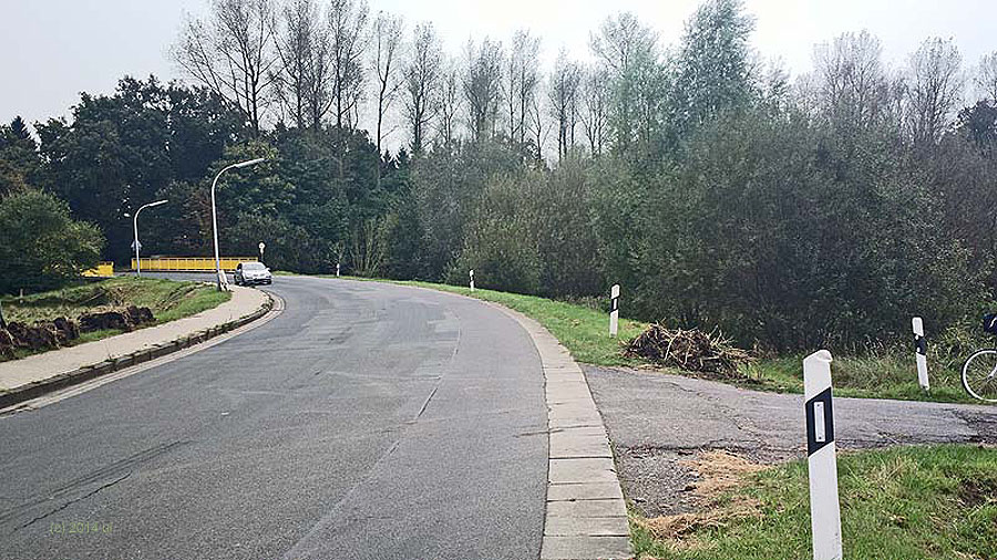 Nach erfolgreicher Trog-Unterquerung und einem interessanten Ritt an der Bahn entlang stößt der sicher sehr überraschte Radfahrer völlig unvorbereitet hinter einer scharfen Rechtskurve auf einen starken Anstieg, an dessen Ende er auf sicher ebenso überraschte Autofahrer treffen kann. Ich stelle mir ältere E-Biker vor, die erst vor kurzer Zeit das Radfahren wieder für sich entdeckt haben, und nun den vermeintlich sicheren und ruhigen Haseuferweg für eine gemütliche Tour gewählt haben. Sie landen nun an dieser Stelle, müssen Kraft aufwenden, lenken, schauen, an der Steigung womöglich anhalten, fahren wieder an, übersehen aber einen PKW, der flott wie heute üblich die Linkskurve in den Heideweg hinein nimmt, noch knapp vor dem entgegenkommenden LKW ("Das schaff ich noch!"), und nun plötzlich zwei ältere Herrschaften auf ihren E-Bikes vor sich auftauchen sieht. Die Folgen möchte ich mir nicht ausmalen.