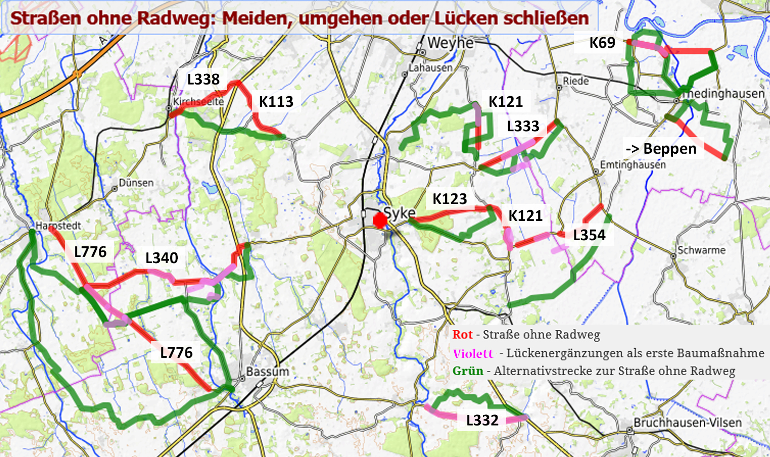| Violett | Lückenergänzungen als erste Baumaßnahme (L332 komplette Strecke) |